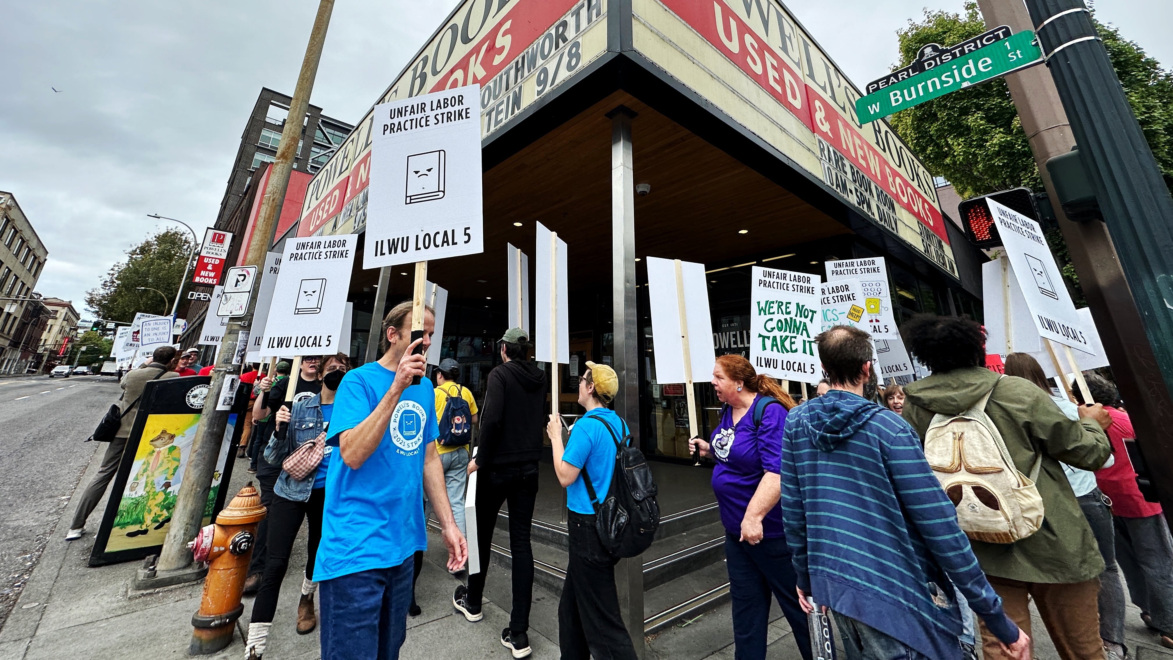 On Friday, The New York Times noted that U.S. work stoppages are poised to reach a five-year high this fall. Today in Portland, that labor unrest received a prominent platform: the sidewalk along West Burnside Street, as Powell’s employees walked off the job and shut down the flagship City of Books for Labor Day.