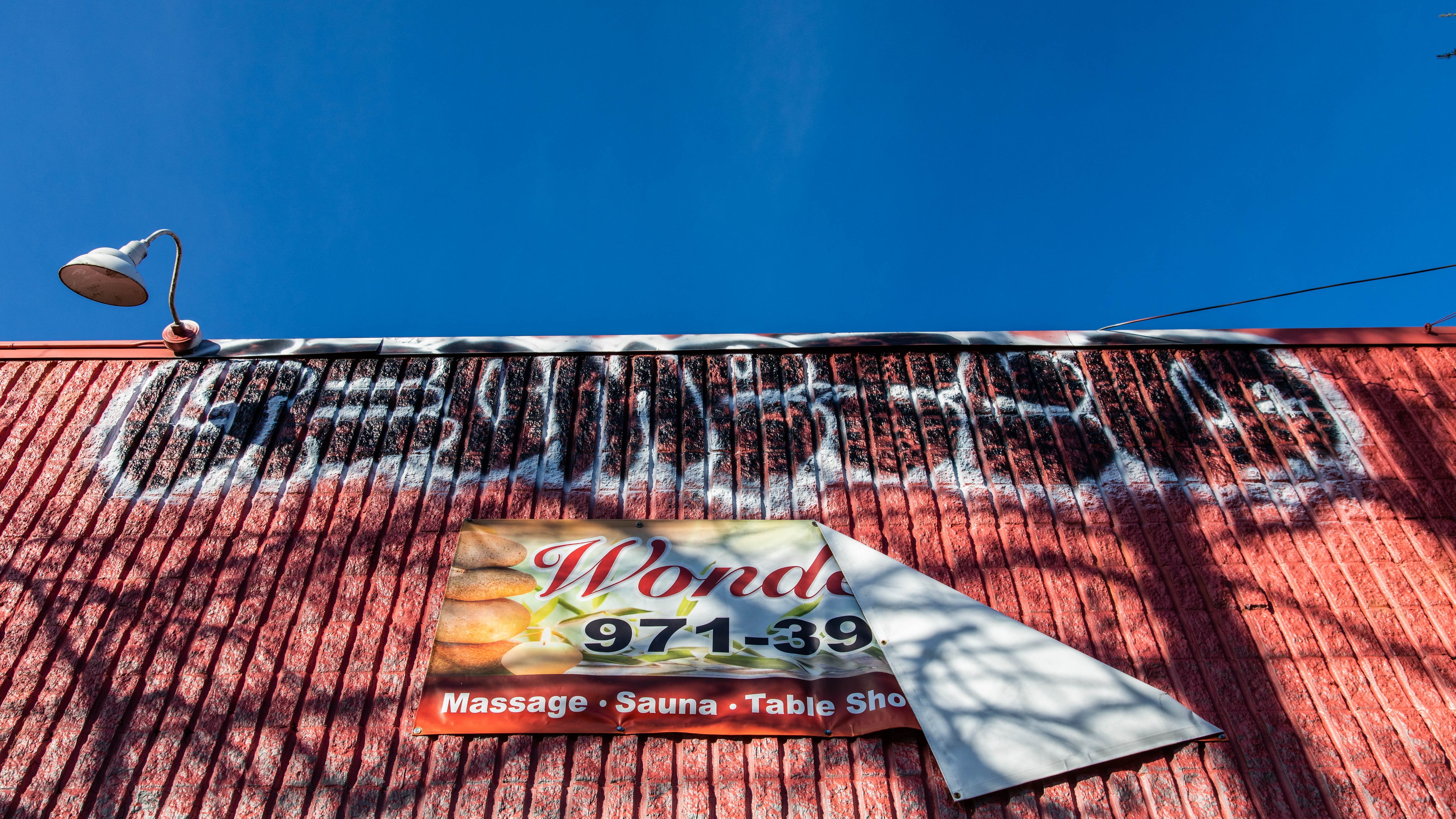 Signs for the Wonder Spa still advertise hours of 10 am to 9 pm, though it appears to be long abandoned. Remnants of signs for a Food Depot and deli are fast deteriorating. (Calls to numbers listed to those businesses went unanswered.) The walls are covered with graffiti on all four sides, and the parking lot contains a fallen tree.