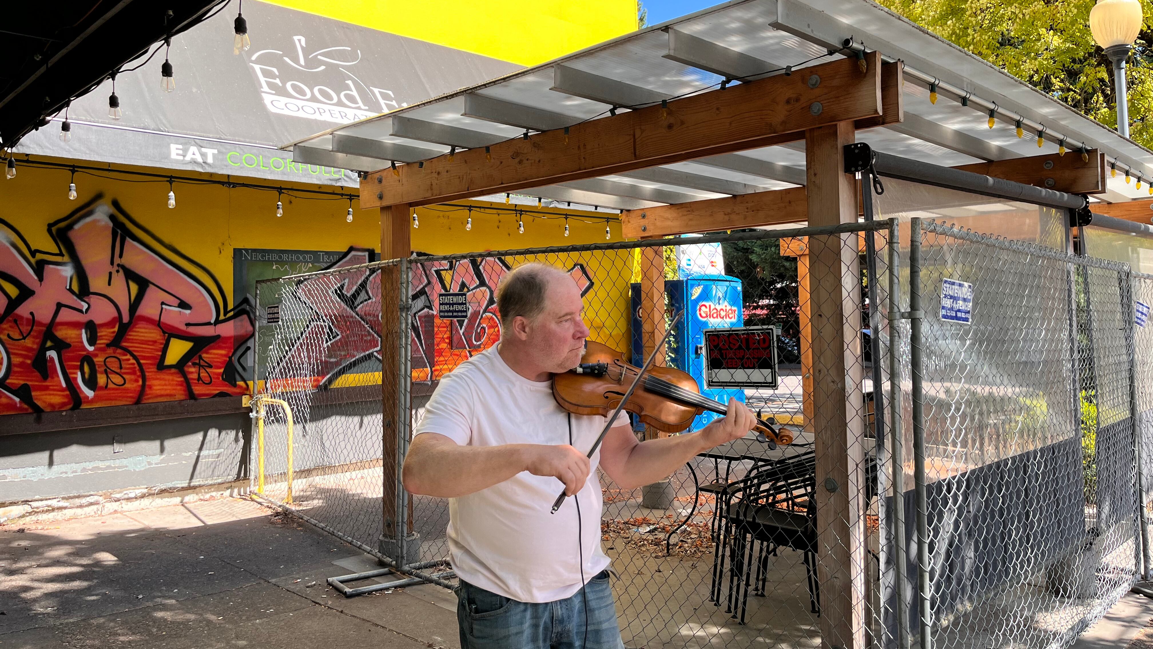On a recent Friday afternoon, a violinist in jeans stood outside the fenced front door of the shuttered grocery co-op Northwest Food Front playing “Simple Gifts,” the poignant Shaker hymn.
