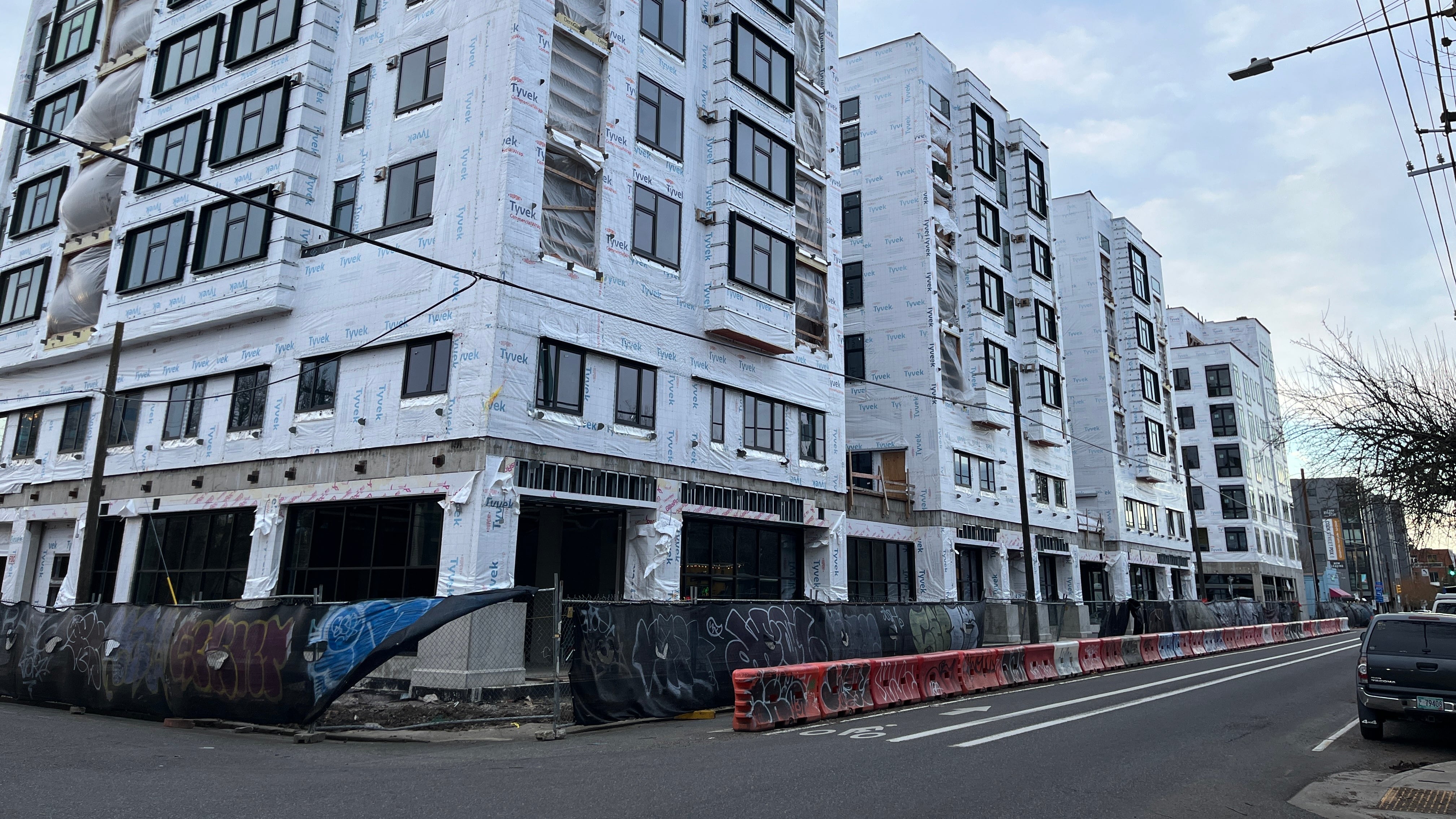 The two tall apartment buildings on North Williams Avenue at Fargo Street look like ghosts, clad as they are in bright white Tyvek sheathing and nothing else.