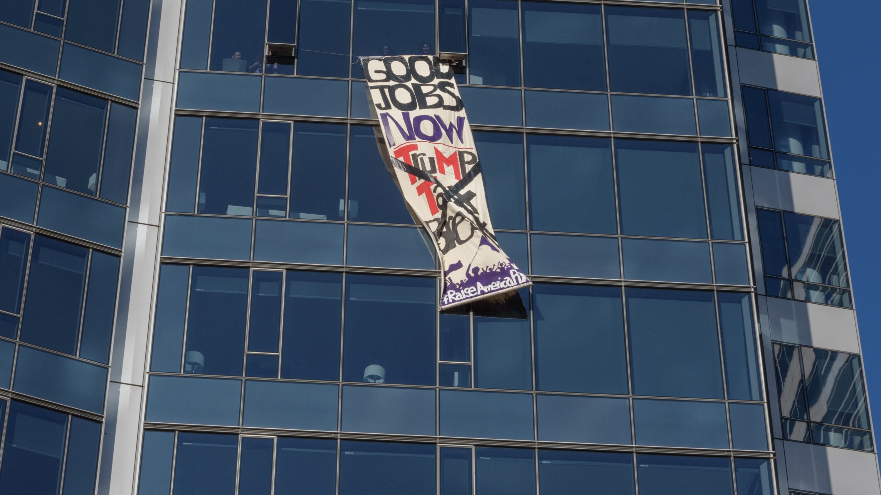 SEIU Local 49 organizers dropped a banner out of an 11th-floor window of the Park Avenue West building that read in part: "GOOD JOBS NOW." They were protesting the lack of unionized cleaning jobs in the tower—a reversal detailed by WW in this week's edition.