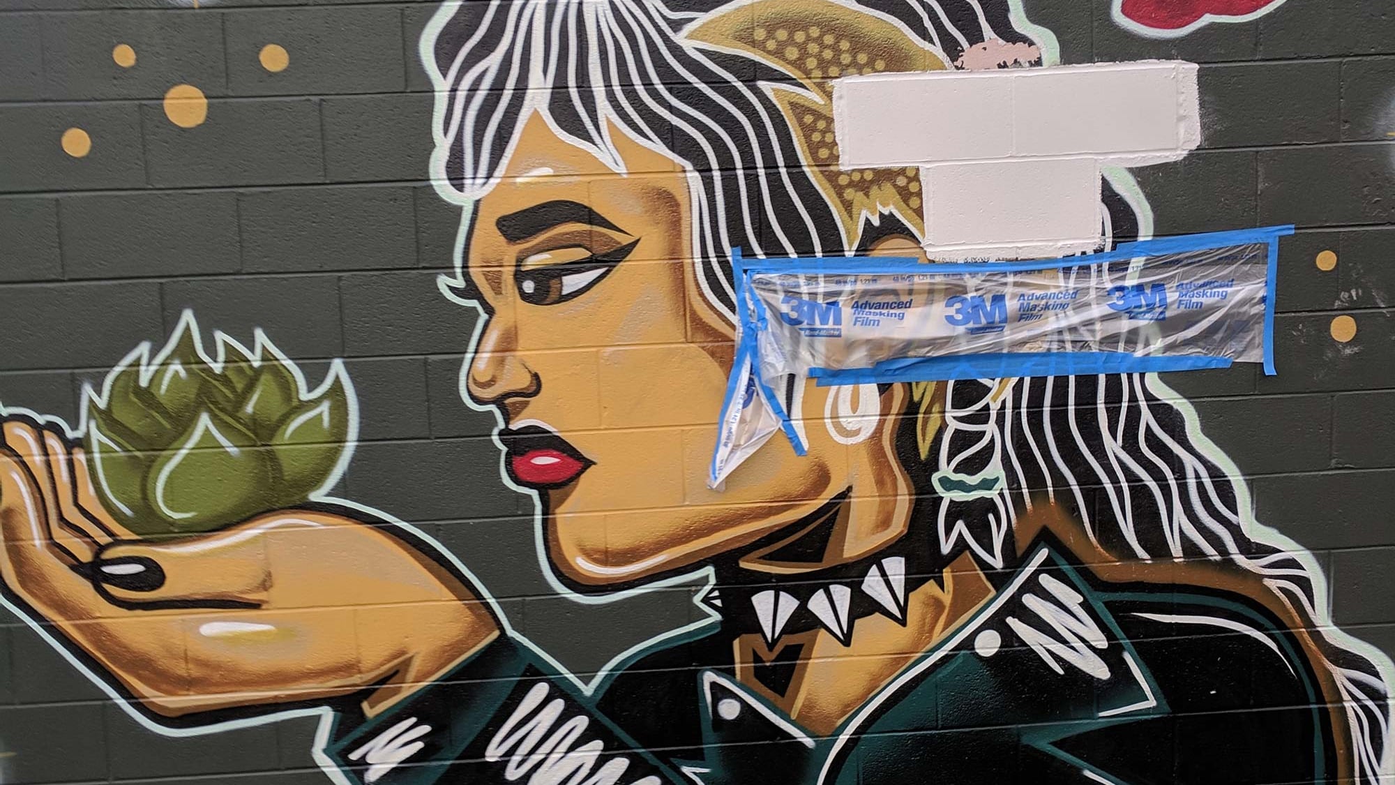 The mural was painted last October and damaged by a city vehicle in January. Rather than repair the damage to the original, the property owner buffed it and hired a different artist to paint a new one.