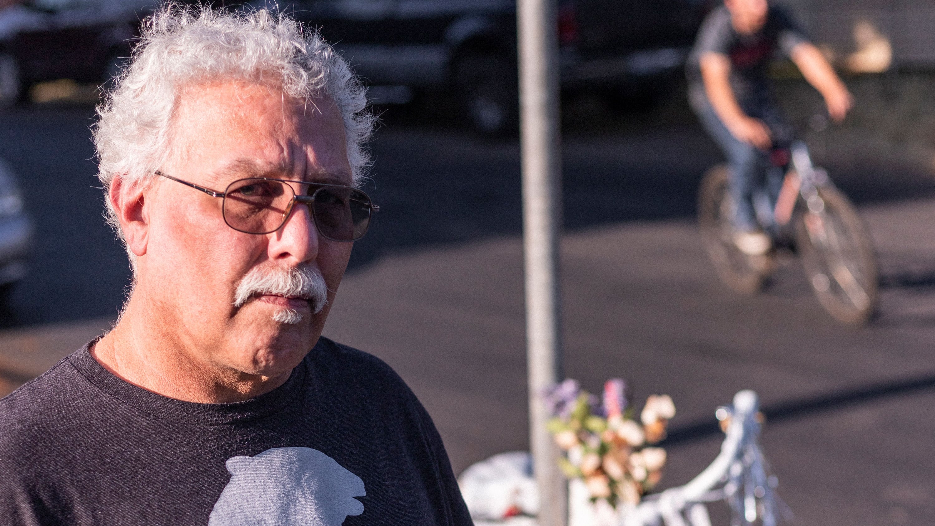 At the intersection where Hart died, mourners placed a white bicycle—a "ghost bike"—and adorned it with flowers. Before the ride started, Meyer says he strapped Hart's graffitied skateboard to his back. The strap broke at the site of the crash. Meyer left the skateboard there.