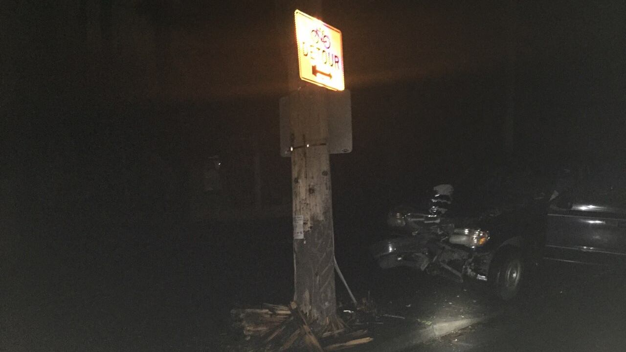 A photo of the pole and car provided by police shows a splintered wooden pole casing. The photo shows significant damage to the front of the vehicle.