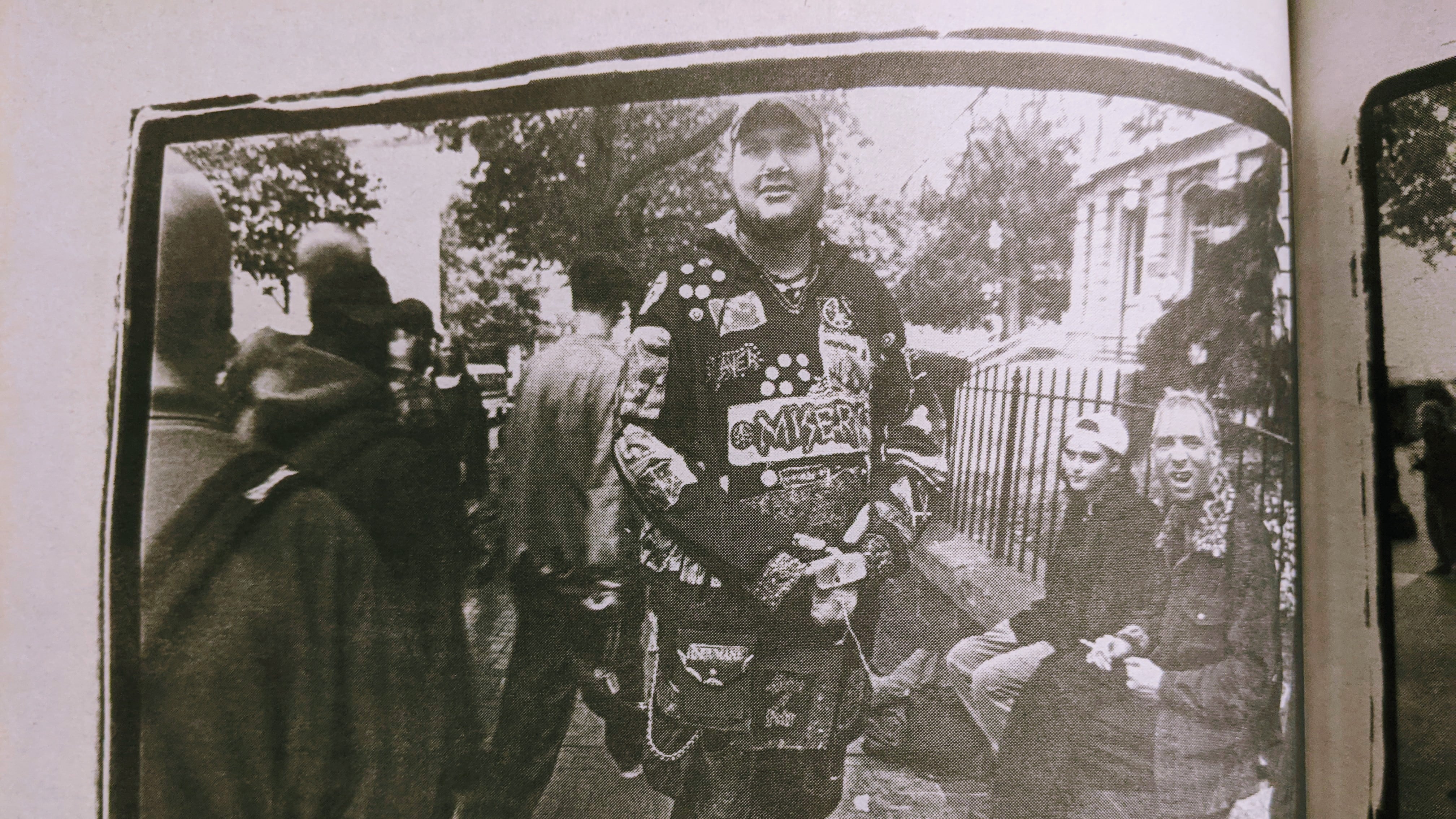 His real pride and joy is his leather jacket. Wrinkled, crumpled, stepped on and slept in a thousand times, the jacket-has a personality (and an aroma) all its own. The epaulets bristle with metal spikes, which he picked out and installed himself. Hand-drawn skulls and punk band logos crowd the arms and back, while the edges are studded with the aluminum tops of disposable lighters. A small stuffed dog, known as a pound puppy, is stapled to the lapel with a safety pin.