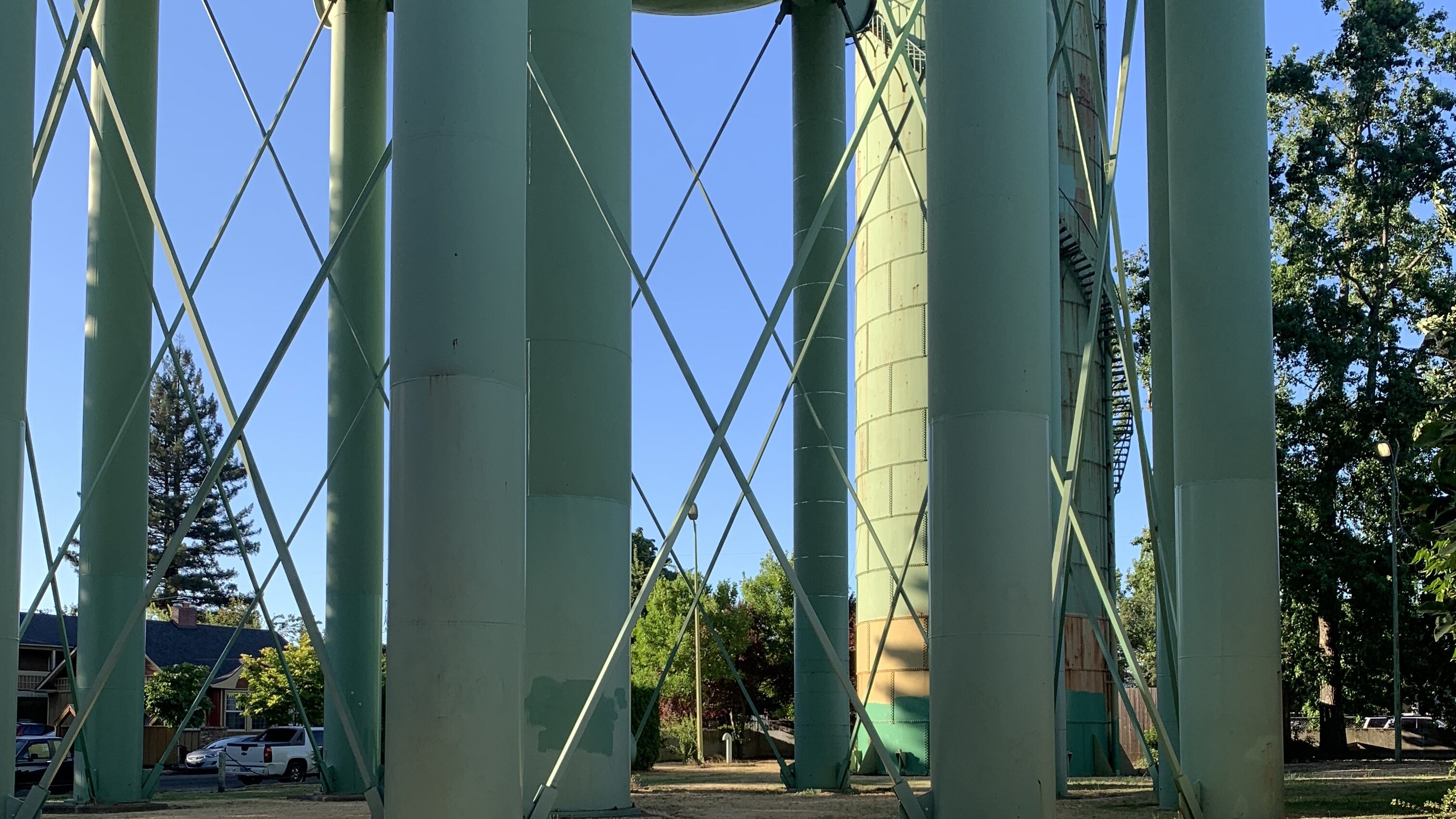 The lot adjacent to busy North Willamette Boulevard lies near the Willamette River in the St. Johns neighborhood and is tucked between houses on three sides. About three-quarters is fenced. Two huge water tanks tower over the small, rectangular lot. Around the taller, thinner tank, called a standpipe, a spiral staircase winds to the top. The more massive tank stilts on 11 trunklike legs. Both structures would have to be taken down, a project that would cost the Water Bureau at least $200,000.