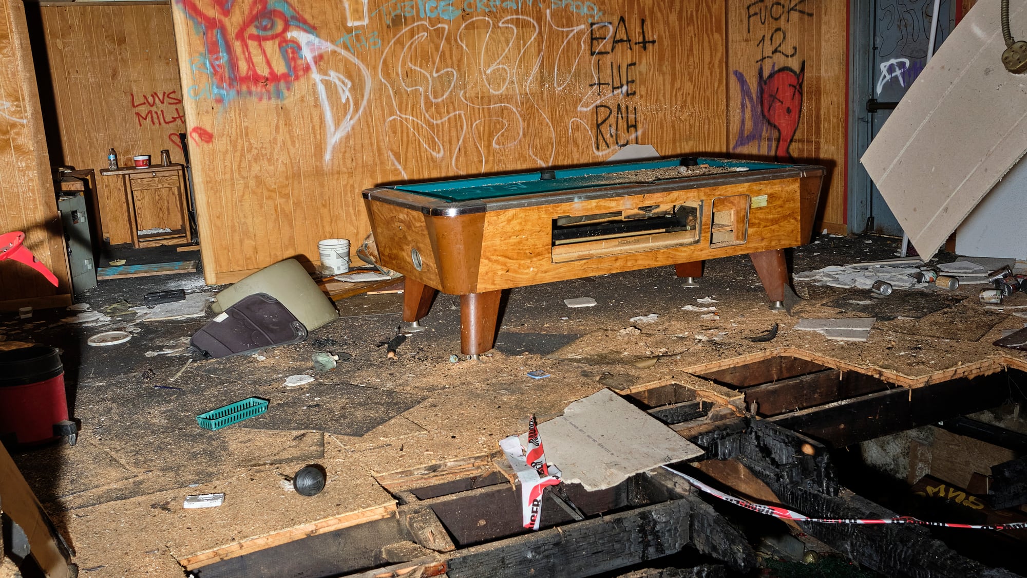 On Saturday, a man was asleep on a couch inside. A hole had been burned through the floor into the cellar. The walls were covered with graffiti, the buildings’ wiring, furniture and appliances had been plundered by thieves.