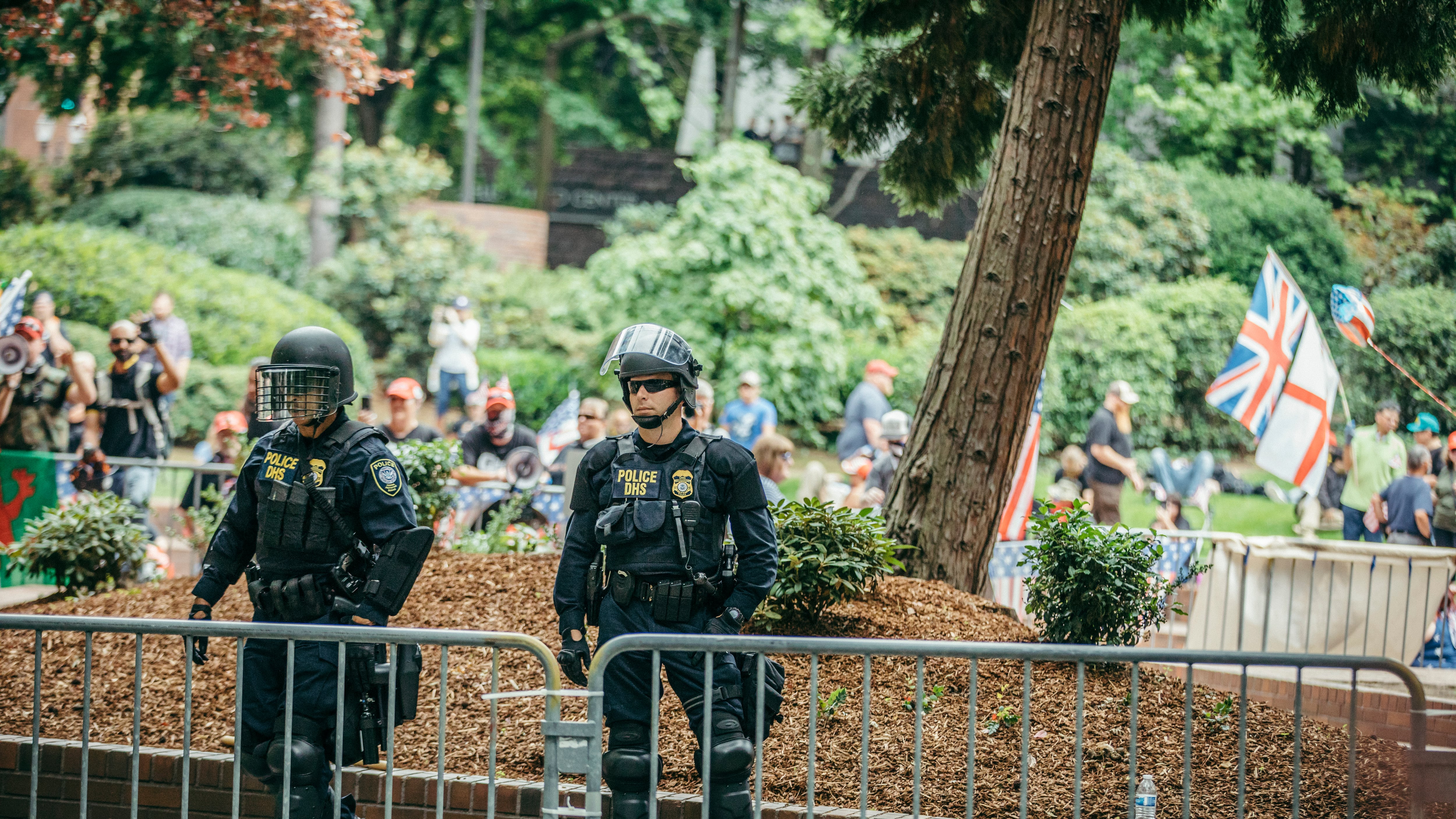 During the rally, law enforcement officers coordinated with Patriot Prayer leaders to determine who would or would not be allowed in the plaza.