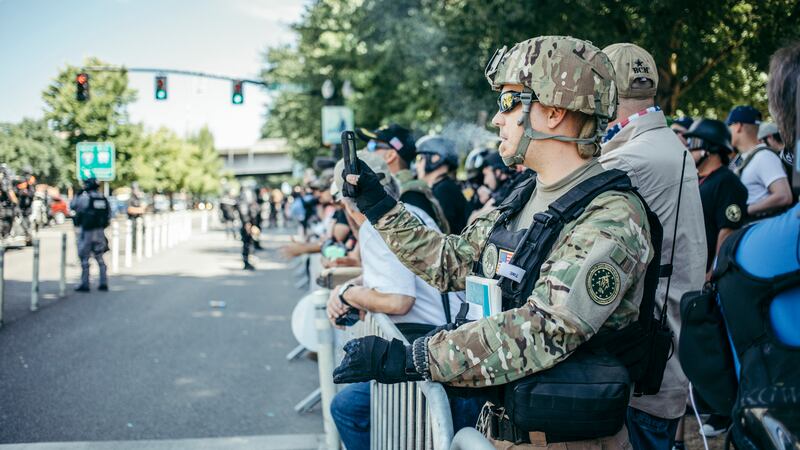 The Oath Keepers and Three Percenters are anti-government paramilitary organizations with members who have frequently shown up at far-right rallies in Portland.