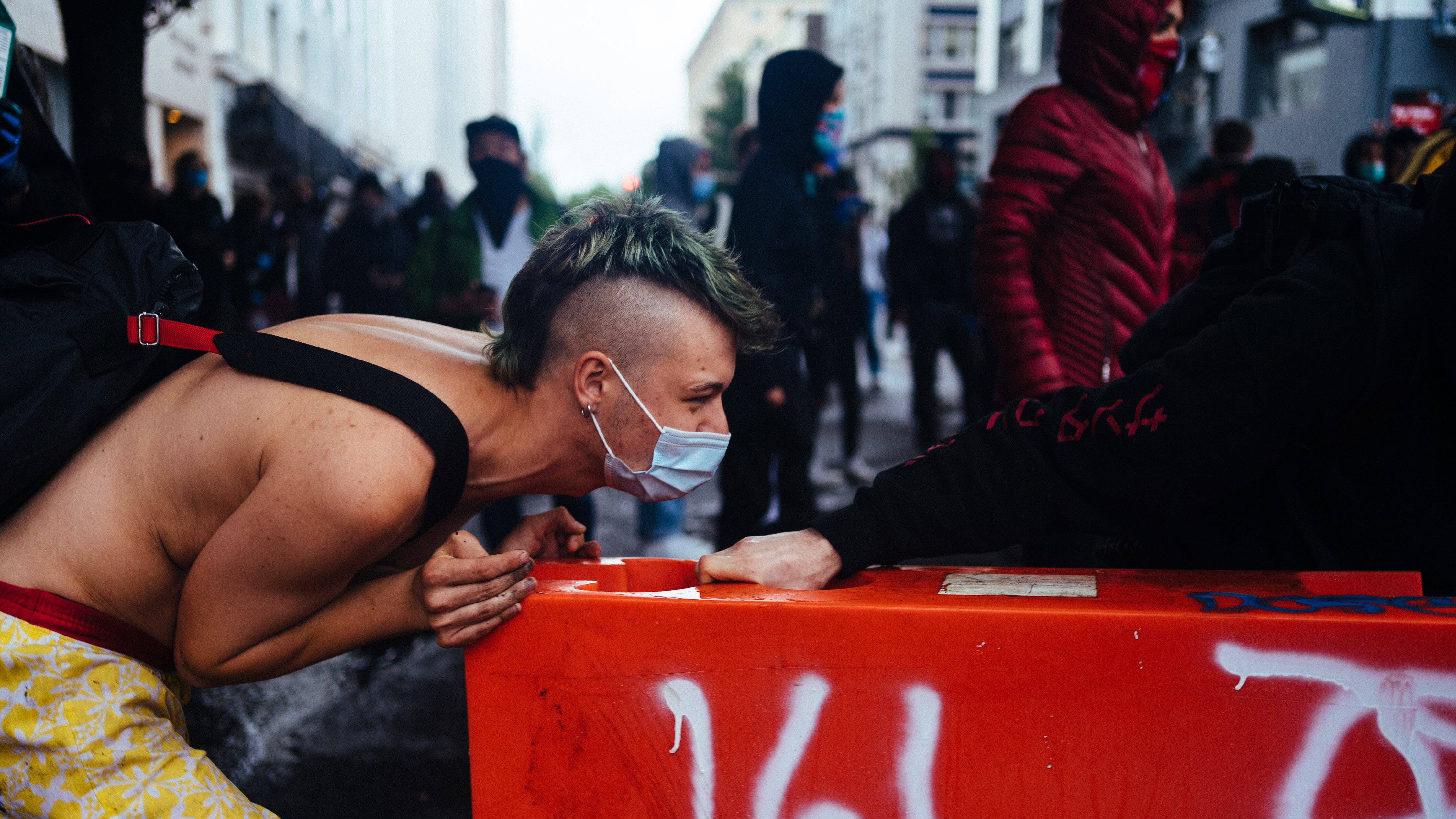 Despite the 8 pm curfew declared by Wheeler, the first demonstrator standoff with police started well before dusk. At 7:03 pm, police deployed flash-bangs, sometimes known as concussion grenades, and arrested a woman.