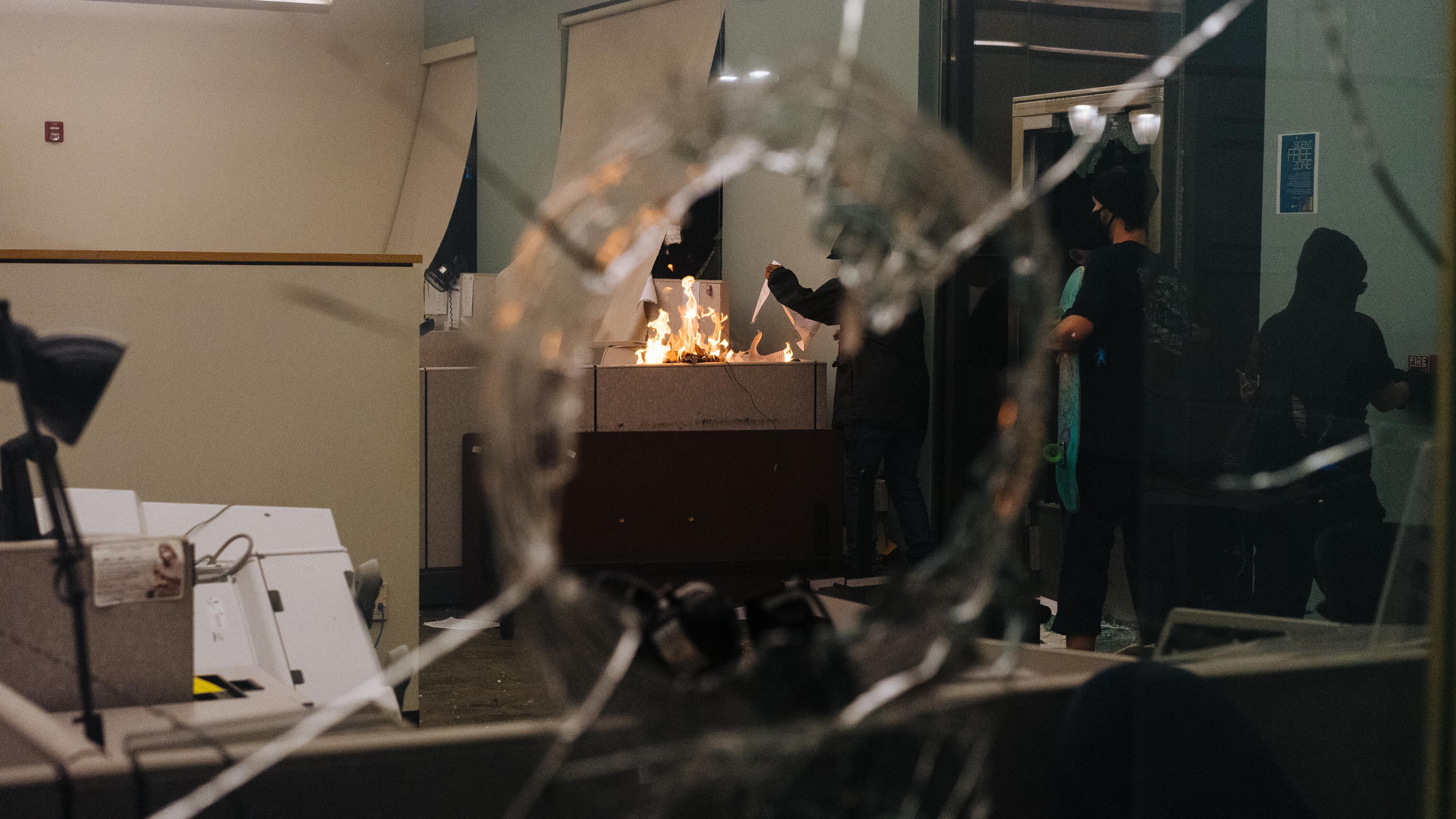 Video captured by WW photographer Alex Wittwer on Friday night shows protesters smashing in the windows of the Justice Center and setting fires in office cubicles.