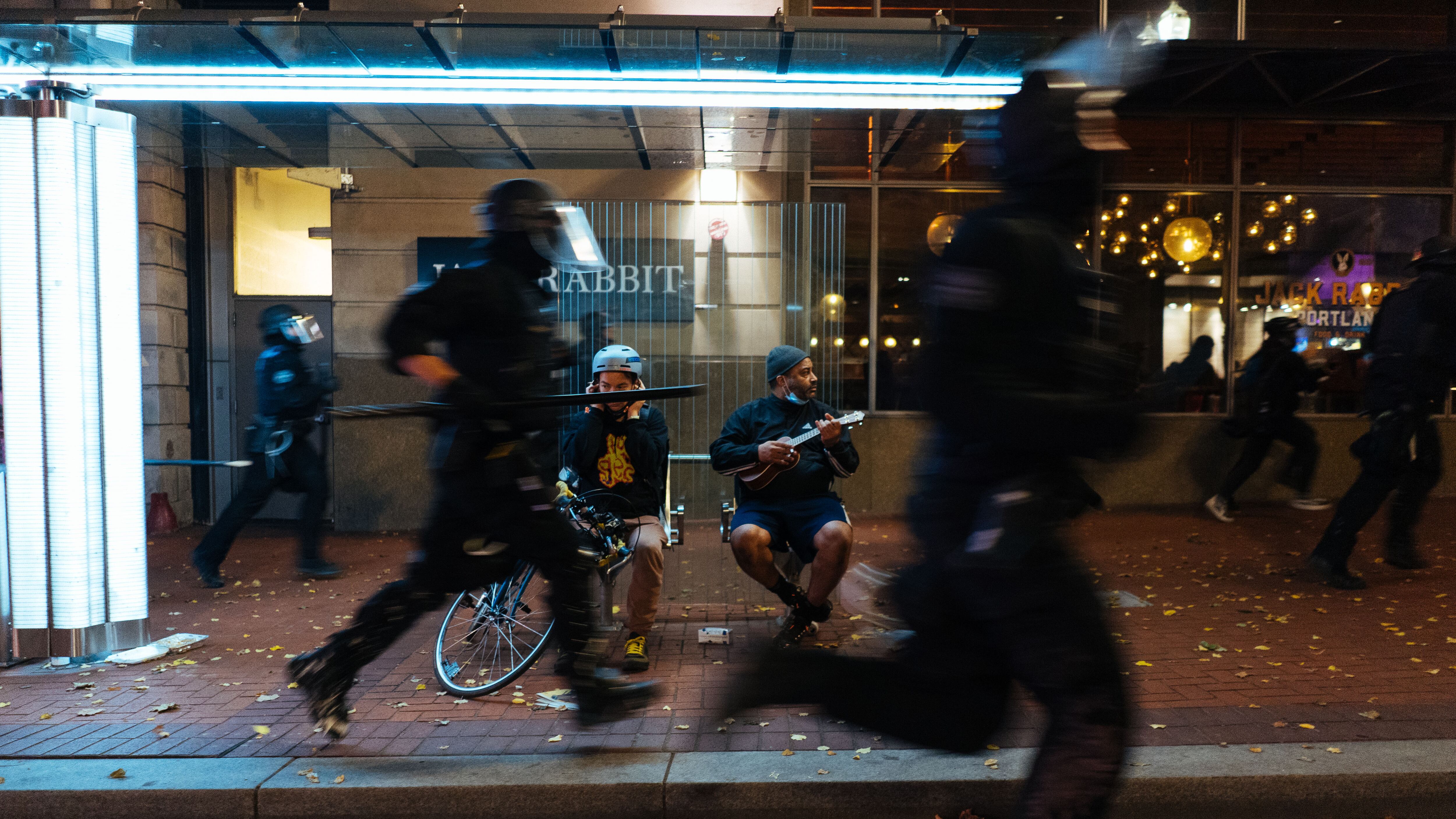 The Multnomah County Sheriff's Office, for its part, described protester behavior as out of control. "At one point, an officer was attempting to load an arrested person into a transport van when another arrested person, Michael Colten, forced his way out," the sheriff's office said in a press release. "He ran while still restrained in zip-ties for about two blocks before he was recaptured by officers."