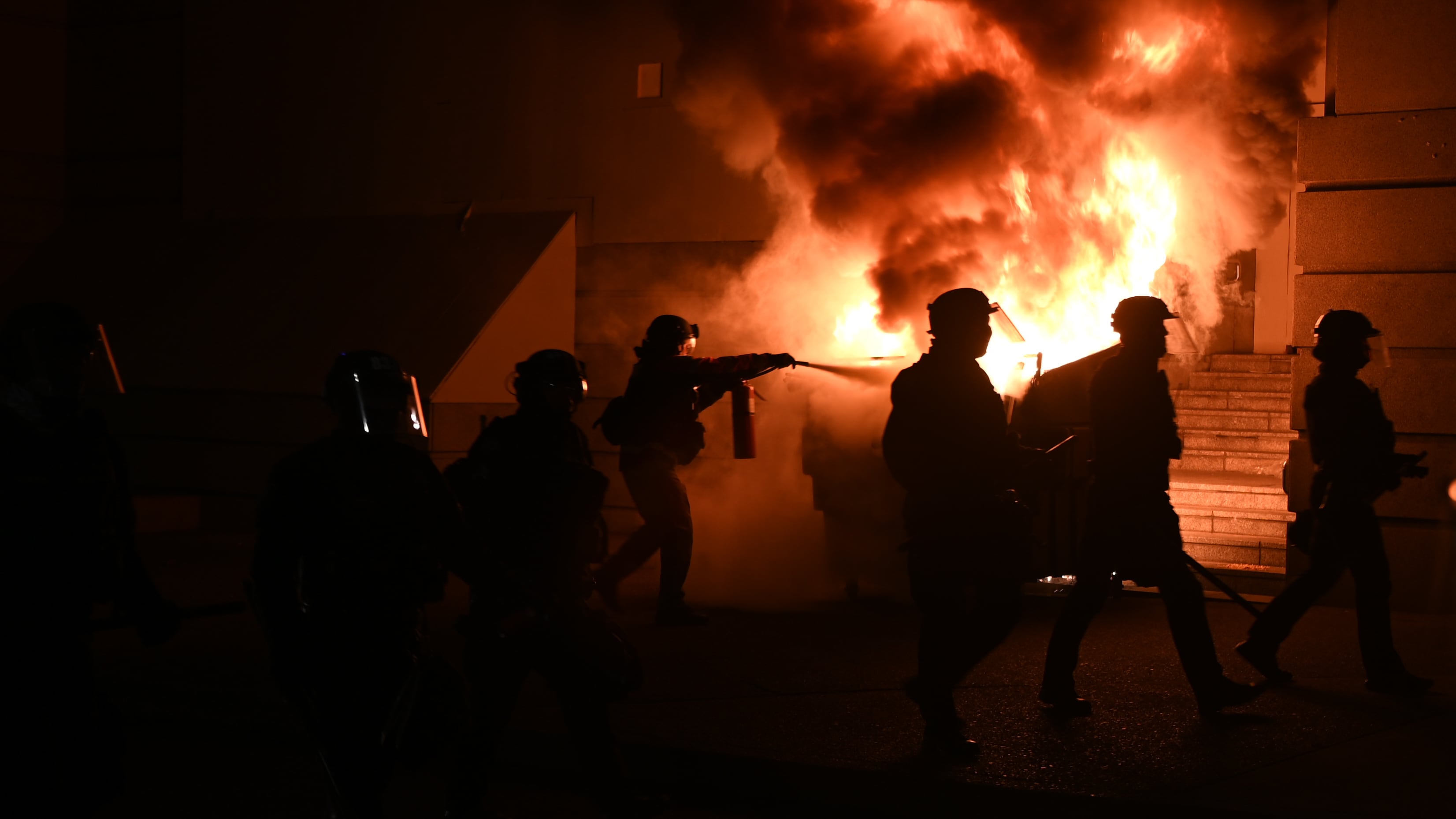 The evening began in front of the Multnomah County Justice Center where a crowd assembled. Initially, members of the crowd set off fireworks and lit a plastic dumpster on fire. After Portland police declared the assembly unlawful, and doused the dumpster, the crowd marched en masse to City Hall. There they broke several windows and spray-painted anti-police messages like “ACAB” inside the building’s rotunda. At this point, police declared a riot.