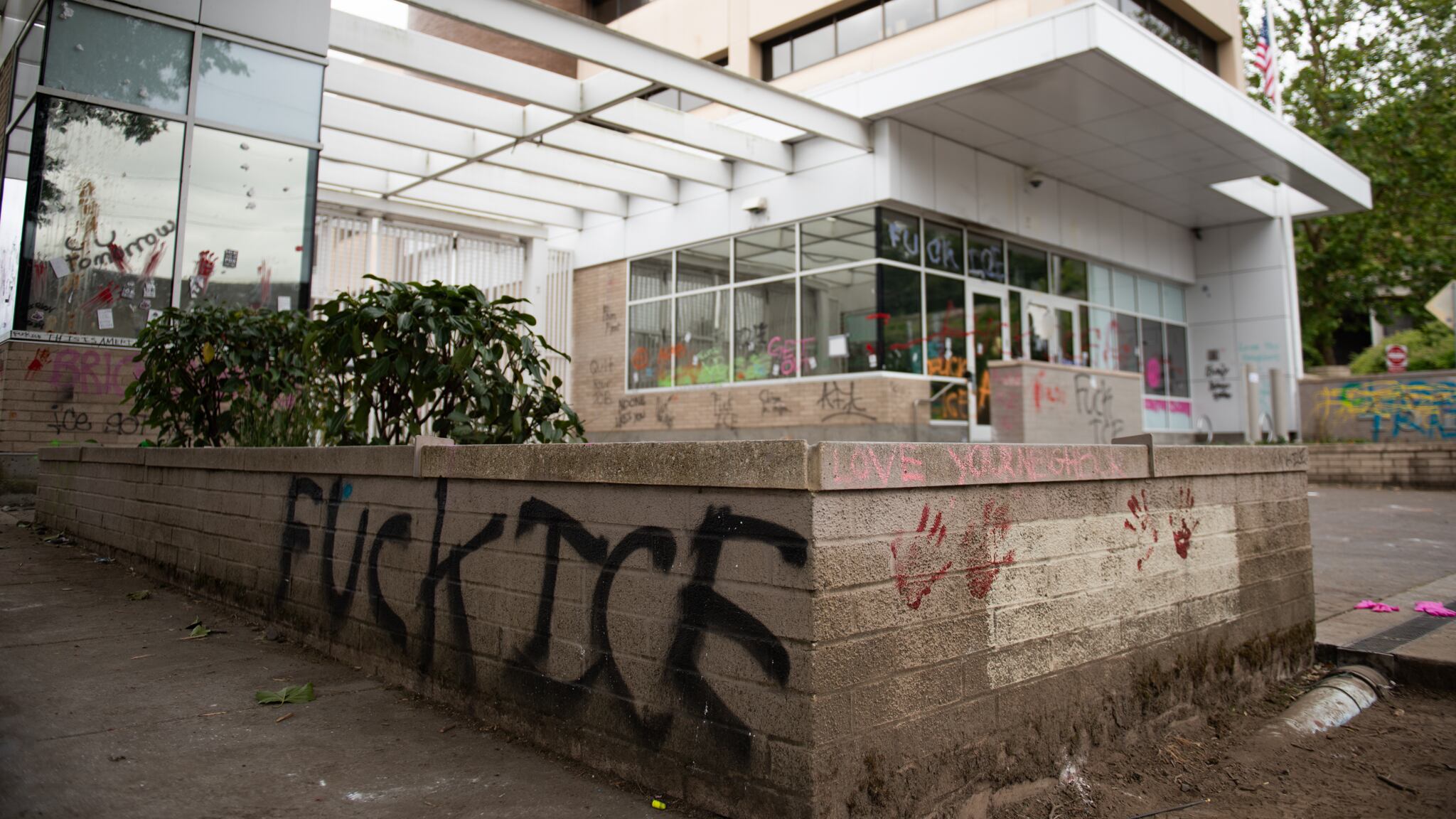 By the time protesters who branched off from the larger march arrived at the ICE facility Saturday evening, agents were already meeting demonstrators with less-lethal munitions, and the front facing part of the building toward South Macadam Avenue was already covered in graffiti that read “FUCK ICE,” “ICE OUT OF PDX” and “BRING THEM HOME.”