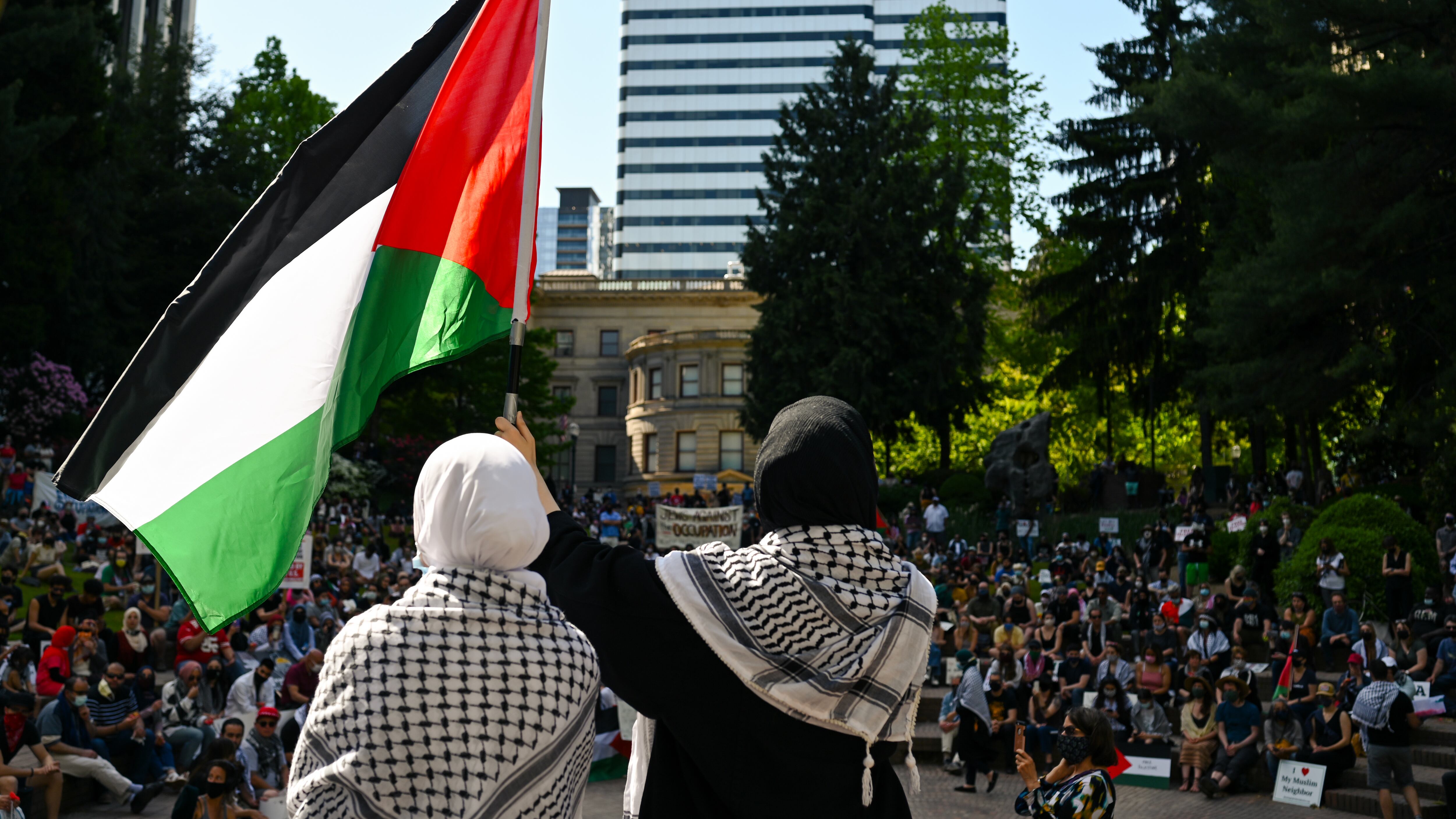 “Free Palestine! Free Palestine!” a crowd of 400 people chanted. They filled Terry Schrunk Plaza and then some, spilling back into the trees and shrubs. That’s nearly as many Portlanders who listed Palestinian as their ancestry in 2019 census data.