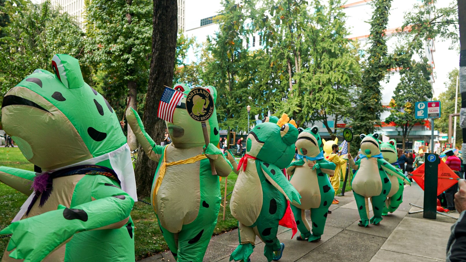 This letter is a call to action. A call to show that many Portlanders value community and that we will NOT be browbeaten down into the mud. We come armed with frogs, humor, and empathy. Let us not stop here. We all have something to contribute that does not have to be monetary. As [Miranda] Luis-Silva told Willamette Week: “I have been a single mother. I’m not in any better position myself; I just struggled to pay rent in October also. But I have a restaurant, so I have the ability to cook en masse so, what the heck, I’m going to do it.” We can do this together. You, me, the frogs frolicking in “war torn” streets, and every last person in our quirky weird corner of the Pacific Northwest.
