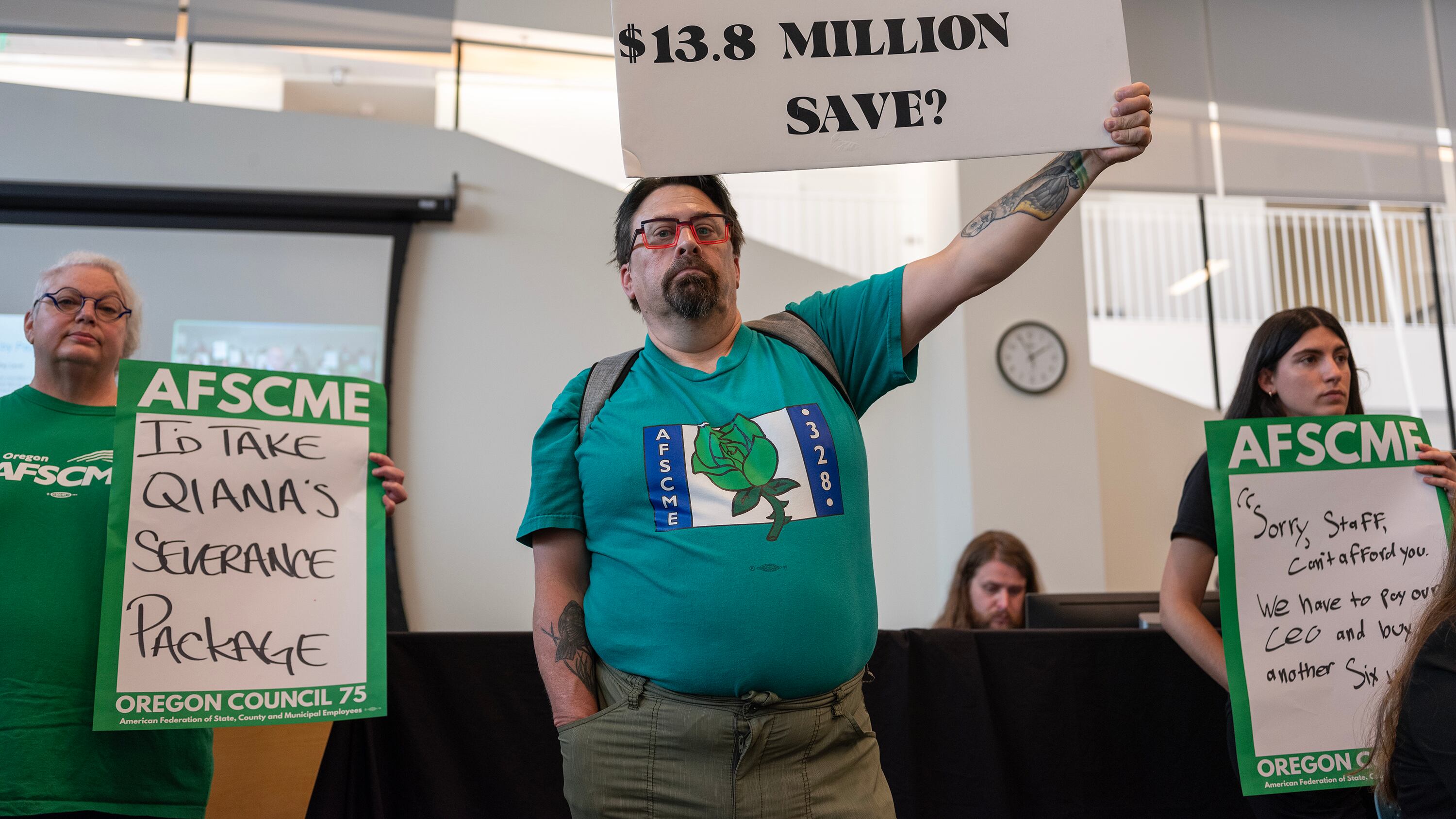 An estimated 75 members of the American Federation of State, County and Municipal Employees Local 328 and the Oregon Nurses Association filled the room to protest the job cuts. They held up signs reading “C-Suite Jobs Are Not Patient-Facing Positions” and “Hospitals Should Budget Healthcare.”
