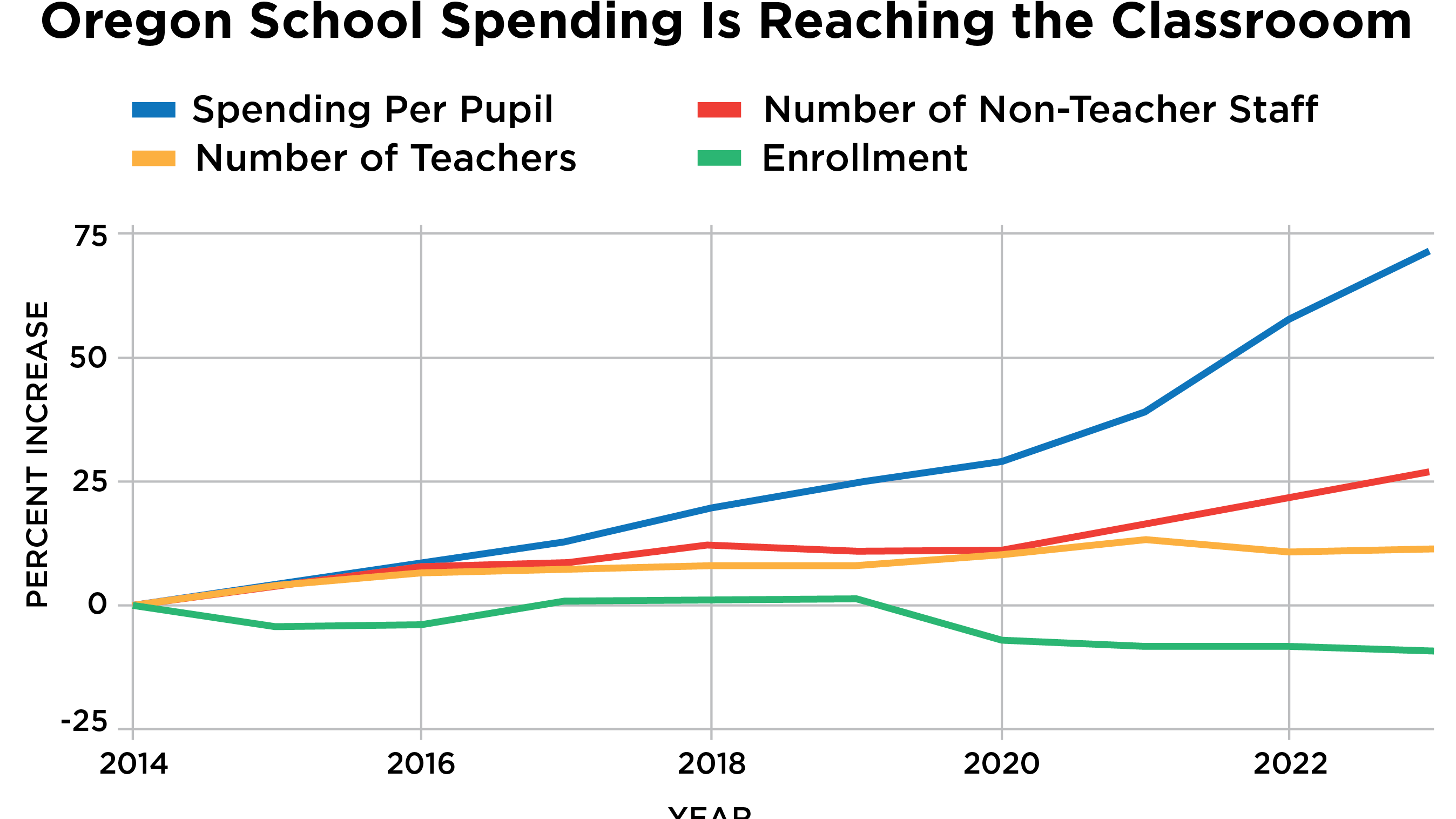 Oregon has done a “pretty remarkable job,” Tapogna adds, of increasing spending per student over the past decade, thanks in part to general fund allocations and the Student Success Act (a 2019 law that increased education funding by creating the corporate activities tax).