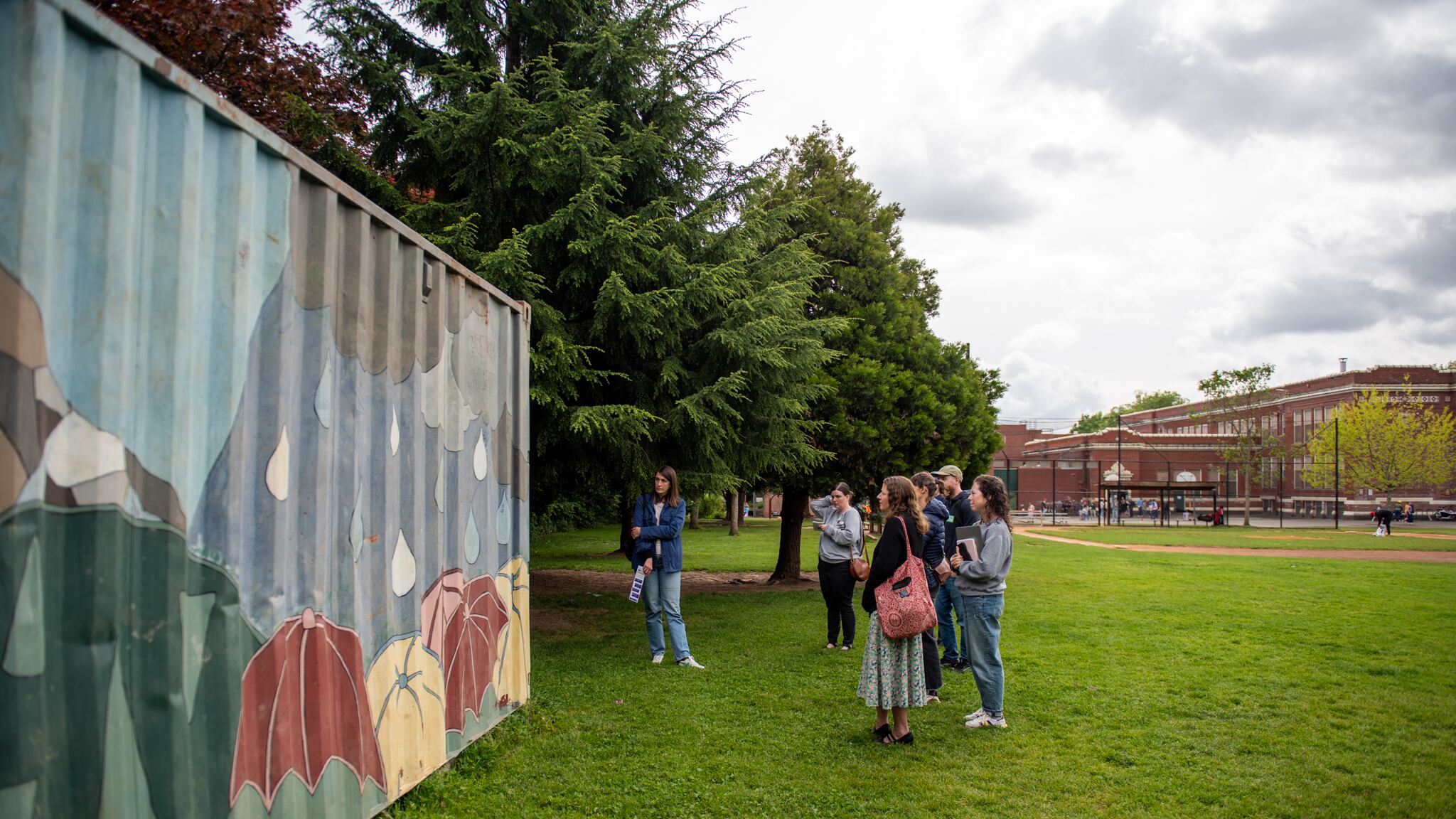 A shipping container stands at the corner of Beverly Cleary K-8 School in Northeast Portland, meant to be cracked open if the Cascadia subduction zone earthquake strikes during school hours.