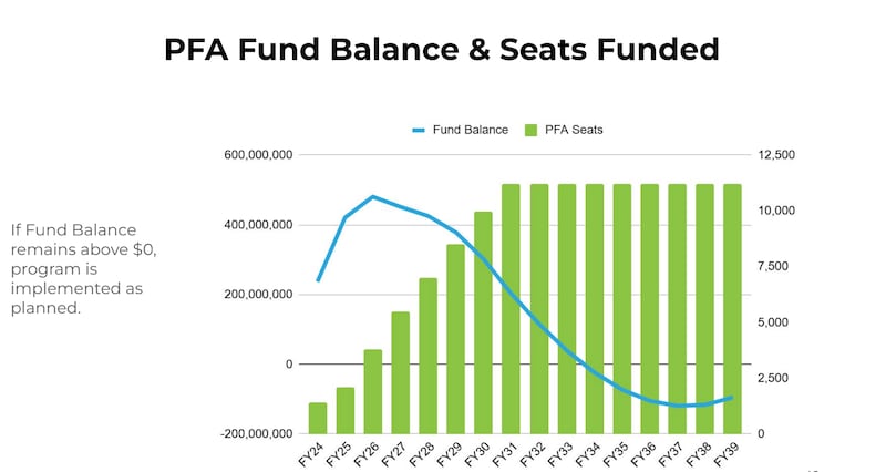 County officials have long anticipated the Preschool for All would, in its early years, collect more money than it would spend before expenditures began to outpace revenues. The latest iteration of a chart that shows the Preschool for All fund balance mapped against seats funded shows an early outpacing of fund balance in comparison to the cost of the program. By the mid-2030s, the county projects the fund balance dips below zero before slowly recovering.