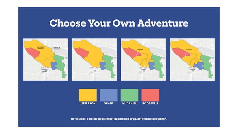 On Oct. 17, PPS released three scenarios for dividing up students who currently choose between attending Jefferson High School or Grant, McDaniel or Roosevelt high schools. The district’s goal: By the 2030–31 school year, all four schools will enroll at least 1,100 students each. District officials say that’s the baseline number the buildings need to function as comprehensive high schools.
