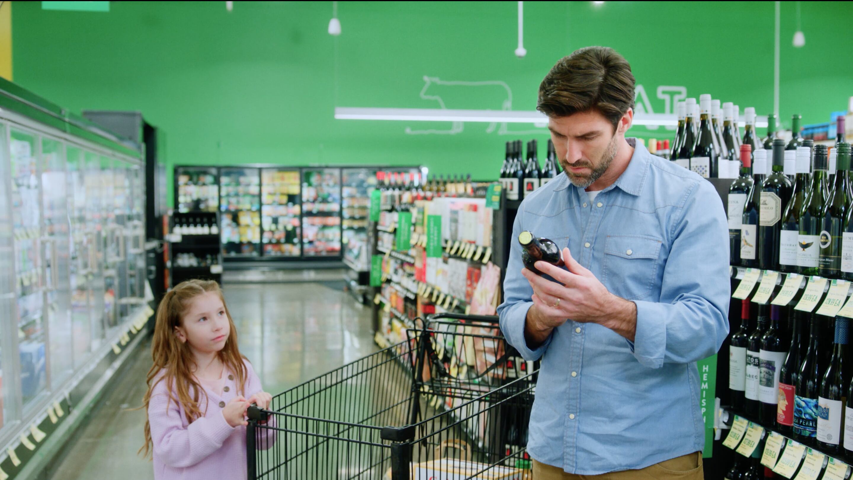 In the 60-second spot, a father first grabs a case of beer (not on his shopping list) and then a bottle of wine (also not on the list).
