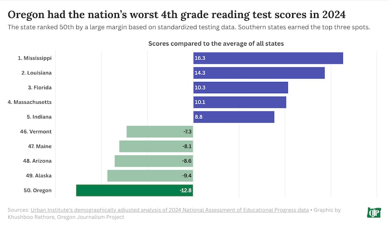 Oregon comes in last among the 50 states for fourth grade reading scores, adjusted for demographics, according to the Urban Institute, and 49th for eighth grade math.