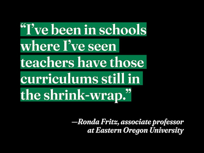 It wasn’t a surprise. “I’ve been in schools where I’ve seen teachers have those curriculums still in the shrink-wrap,” she says.