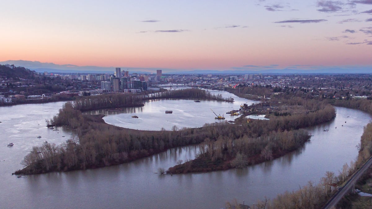 Ross Island Sand & Gravel, one of Pamplin’s companies, mined the Ross Island lagoon in the middle of Portland for sand and rock from 1926 to 2001. After the company ceased mining, it struck a 2002 agreement with the Oregon Department of State Lands, which regulates the state’s navigable waterways, to refill excavations well over 100 feet deep, as well as to restore the upland portions of the island, where the company processed the materials it mined.