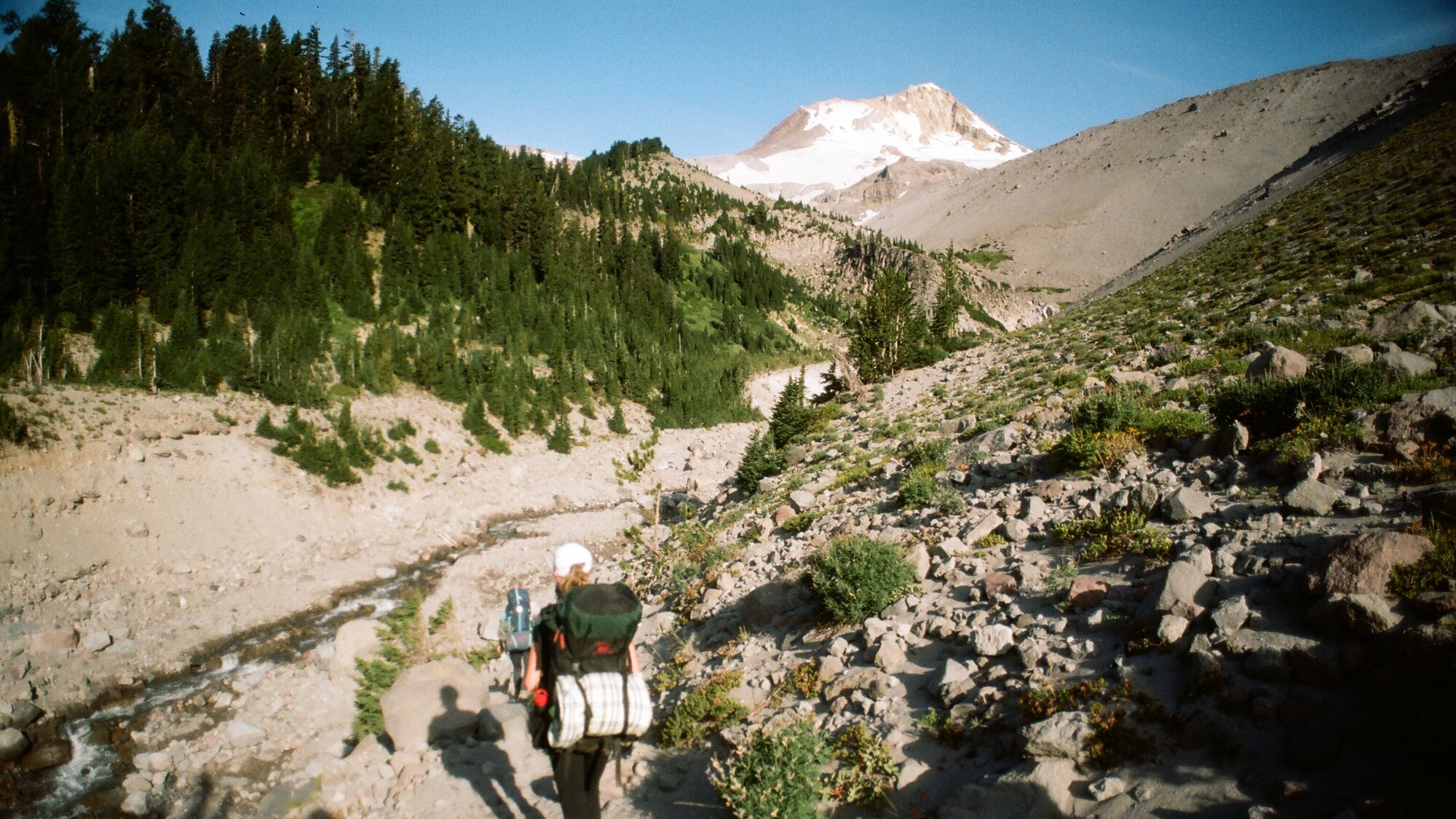 I shivered through our last night on the mountain and awoke to a luminous, blue sky. Looking north, I saw Hood standing tall and peacefully. Despite all the pain, and the adverse trail conditions, I smiled as we strolled by magnificent waterfalls on that last bright day.