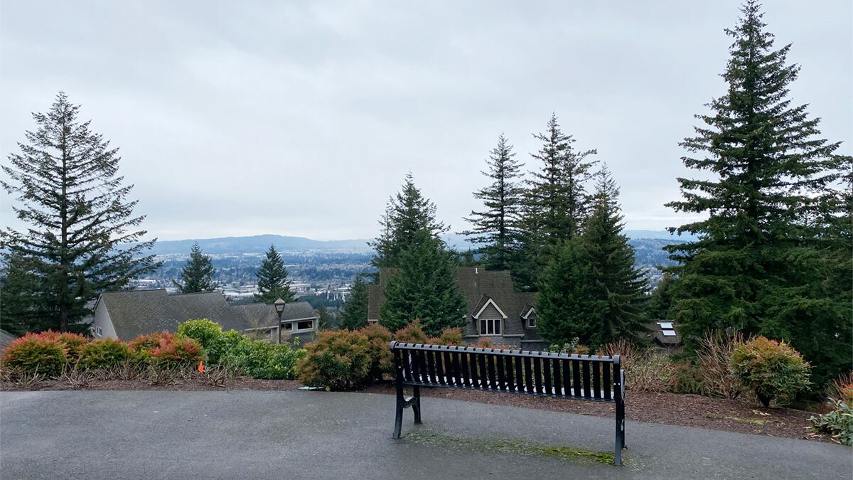You'll feel a steady climb as you continue on up. As you start getting close to the summit, you'll see lots of luxury homes and some '80s-era McMansions. Once you reach the top, there really isn't much to the park itself, just a large grassy patch, a couple benches, and a weather station. But the view of the Tualatin River Valley and the West Hills instantly justifies the trip, especially if you plan for sunset. On a clear day you can even see Mount Hood. It's a nice spot to take a rest or even a picnic break before heading back down the loop.