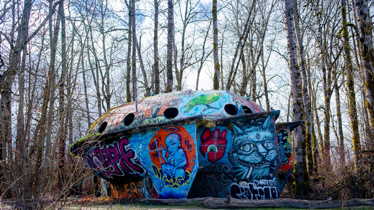 In 1996, an extraterrestrial spacecraft washed up on the shores of Sauvie's clothing-optional beach. In truth, it's actually an experimental concrete sailing boat created in the early 1970s by engineer Richard Ensign. Years before it became a local attraction, it was a functioning vessel that could sleep 12 people and had a wood stove. Its maiden voyage lasted three months, but it ultimately ran aground and was abandoned. A flood deposited it above the shoreline, where it now exists sheltered by the trees and covered in trippy graffiti art, including a blue cat smoking a joint, a heart with an eyeball and, of course, a green alien. Parking permit required.