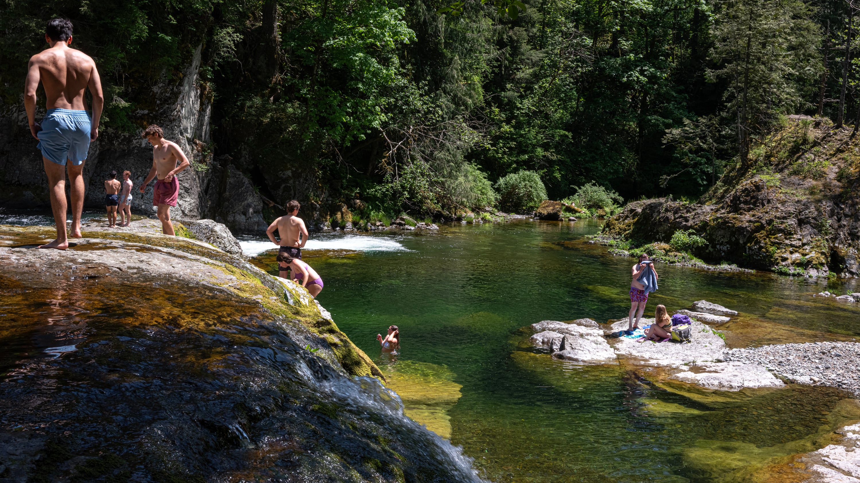 A couple of miles upstream from Dougan Falls, Naked Falls is not clothing optional, but it is a starkly beautiful setting with many flat, sun-baked rocks where you can spread your towel and enjoy easy access to the cool river. This part of the river cuts through private land, so a visit here requires a different parking pass, which makes this generally a less rowdy destination than Dougan. Ideally, buy your $13 pass ahead of time on the website, or purchase one at the Washougal River Mercantile (4232 Canyon Creek Road). Camping is also available to enjoy the serene setting after dark; make a reservation at HipCamp (search for Naked Falls).