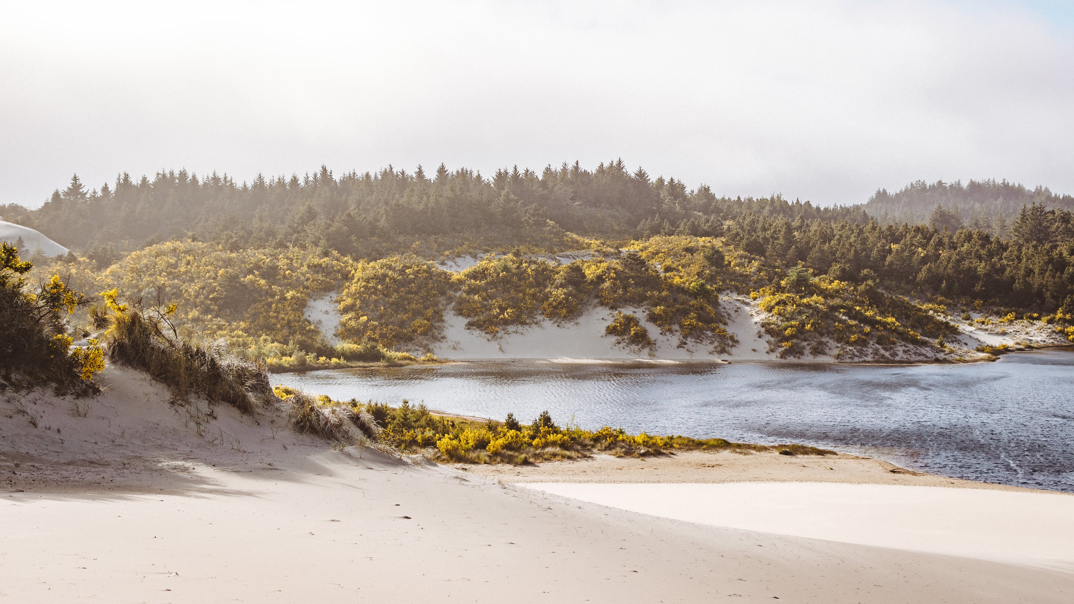 The Oregon Dunes are the biggest coastal dunes in North America, stretching more than 40 miles from the Coos River to the Siuslaw River. They comprise about 30,000 acres and reach as high as 500 feet. But the small sign for the John Dellenback Trail, a few miles south of Reedsport, gives little hint of the marvel to come.