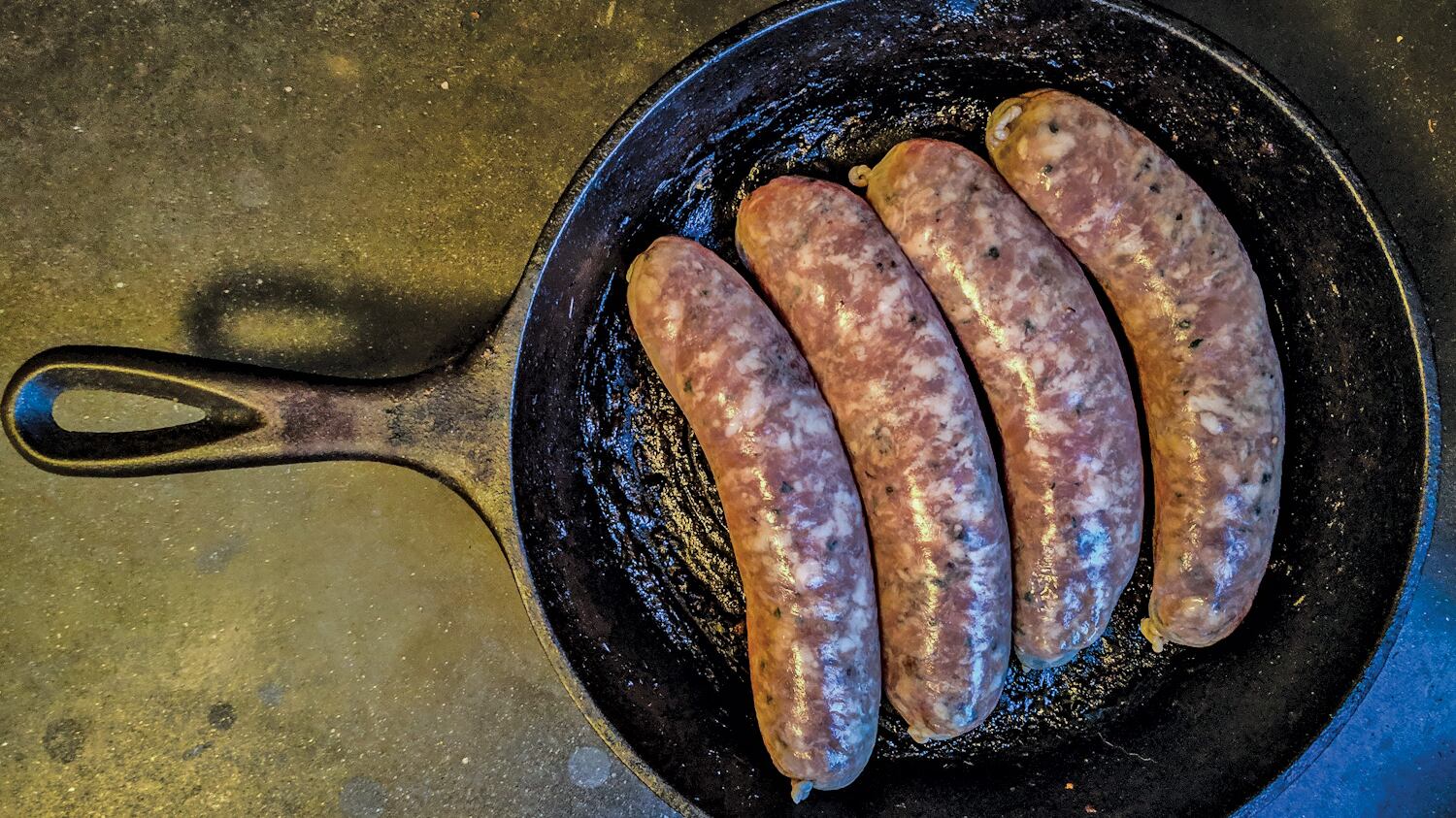 Quickly pan-fried in a cast iron skillet, the sausages are impossibly juicy, never too chewy or firm. They're flavorful, too, with green flecks of fresh herbs that give way to those lemon peel and grassy notes that tend to burst out of hops and hemp buds alike.