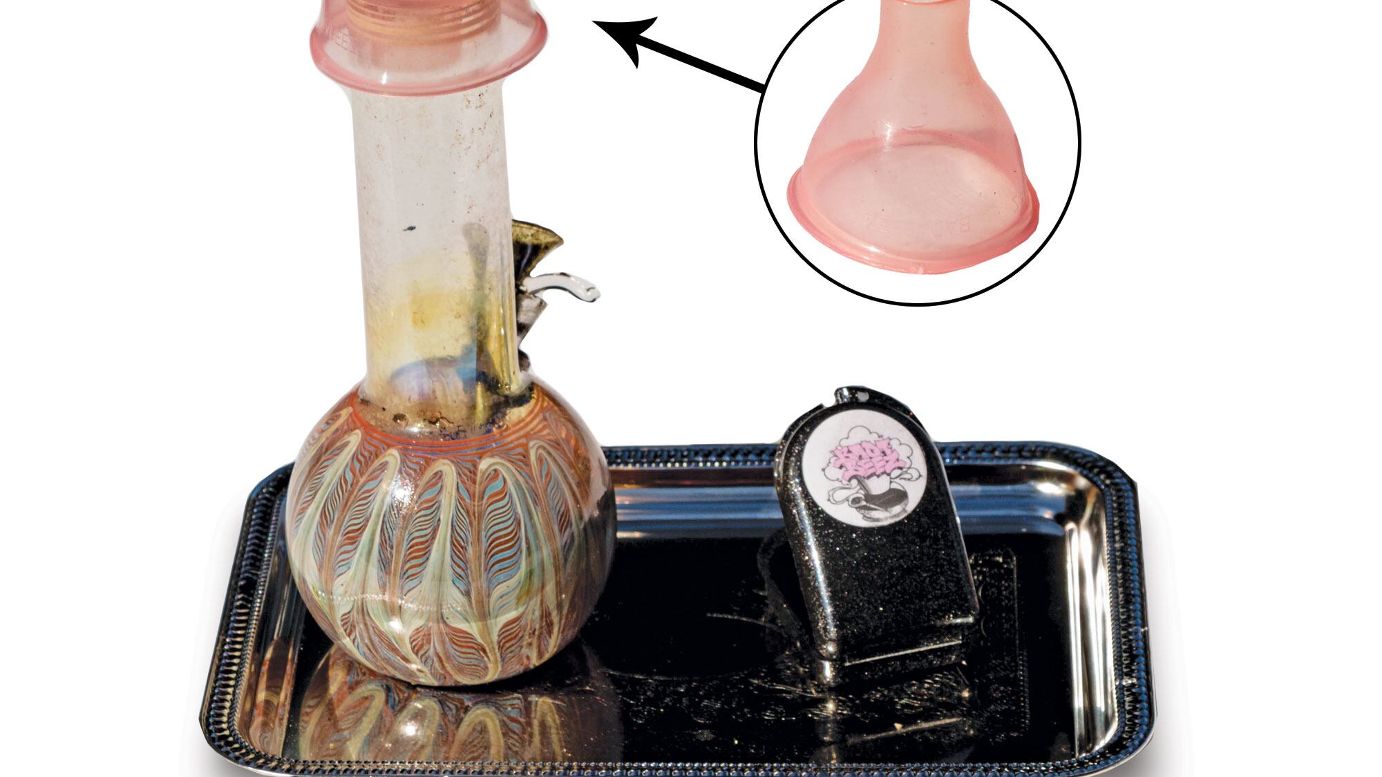 When unfolded, the cover, made by the California-based brand Badabeez, resembles an oversized baby-bottle nipple with the tip cut off. The cover is placed, narrow end first, in the mouthpiece of the bong, then the trumpeting upper half is folded over the rim. It fits an average-sized water pipe but is too large for the narrower mouthpieces of oil rigs or bubblers.