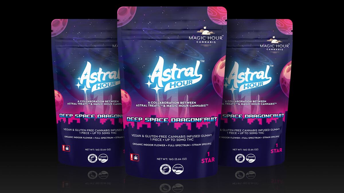 Once back in Portland, it was only a matter of time before the power pot couples began discussing a marriage of Astral’s patented star-shaped gummy with Magic Hour’s flower, and the “Astral Hour” concept solidified from there. Although not the driving force of the collab, the representation of two minority-owned, couple-operated companies is not lost on these young, ambitious entrepreneurs.
