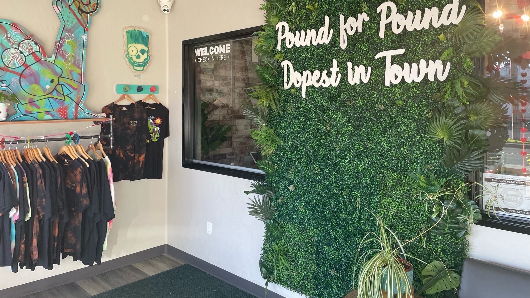 The anteroom of this dispo is a low-key highlight; a grassy selfie wall, emblazoned with the cheeky slogan “Pound for Pound, the Dopest in Town” greets customers upon entry, but is also plainly visible from across the street, which is such a gentle flex considering the family-centric neighborhood population. Candy-colored works by local visual artists are harmoniously arranged on the walls—a feat considering the multiformity of the work—rather than the backlit digital menus or graphic nug posters many of us are accustomed to in dispo waiting rooms. The earnest post-modern gallery vibe removes the buy-drugs-here ambience of other shops, and instead feels more like a soda fountain with hard-candy displays—as if gazing into the windows from the walkway would be both adorable and acceptable. Occasional parking-lot vendor events and socials further boost that energy.