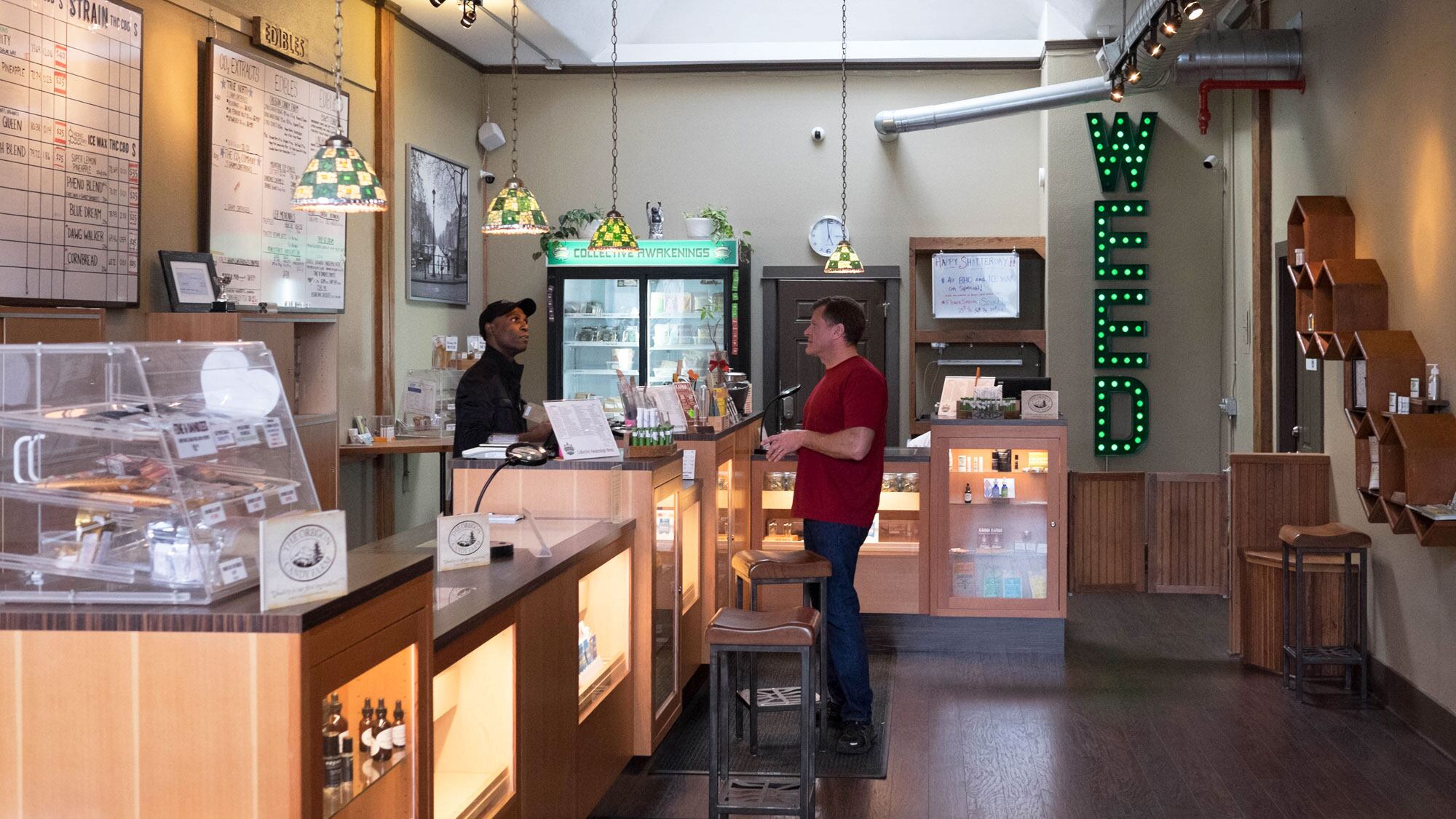 Collective Awakenings is OG. This green-mile stalwart started as a medical dispensary five years ago, and has retained the vibes of the medical spots that opened their doors to rec customers back in October 2015. The waiting room feels New Portland—tropical vibes are rooted in a large tree sculpture—but the staff uses a little walkie-talkie to radio back to the flower room, where you'll be seen only when there's an available budtender. That budtender will attend to you alone, pulling out a lighted magnifying glass so you can inspect each jar. Everything is weighed out carefully by hand, and the budtenders seemed aghast at the idea of anyone in Portland buying prepackaged weed they haven't been able to inspect because it's inside sealed and unsmellable packets. There's not much in the way of vaporizers or batteries, and the meager selection of prefilled oil cartridges isn't competitively priced.