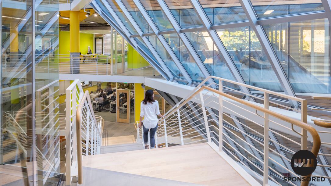 The Karl Miller Center atrium was designed for collaboration. It features versatile event and study spaces to support students and the Portland business community in coming together.