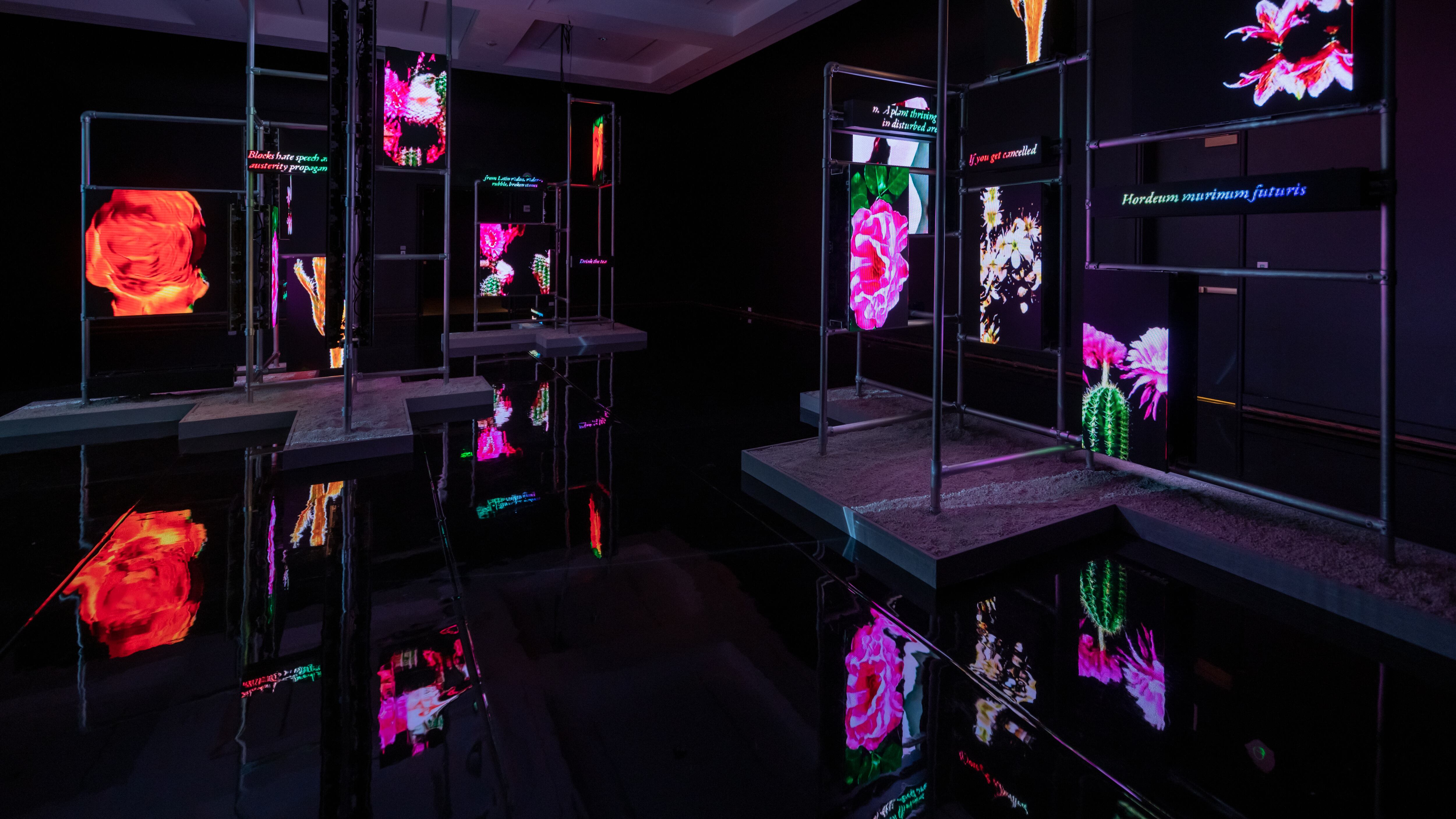 The film sets the viewer up for the rest of the exhibit: video sculptures showing vibrant, flashing imagery of future types of plants. These images are generated by a neural network, based on the machine learning of thousands of images of plants. The snippets of virtual foliage appear in tandem with short texts describing the healing properties of the plants.