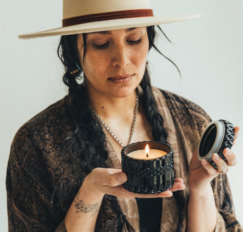 This earthy, luxurious candle is crafted only with pure essential oils —no synthetic scents. Top notes of palo santo, tulsi, cedarwood, and bergamot weave together to calm and clear your spirit. Other oils offer the medicine of grounding, purifying, uplifting — inviting any gift recipient to soften, release,and return to themself.