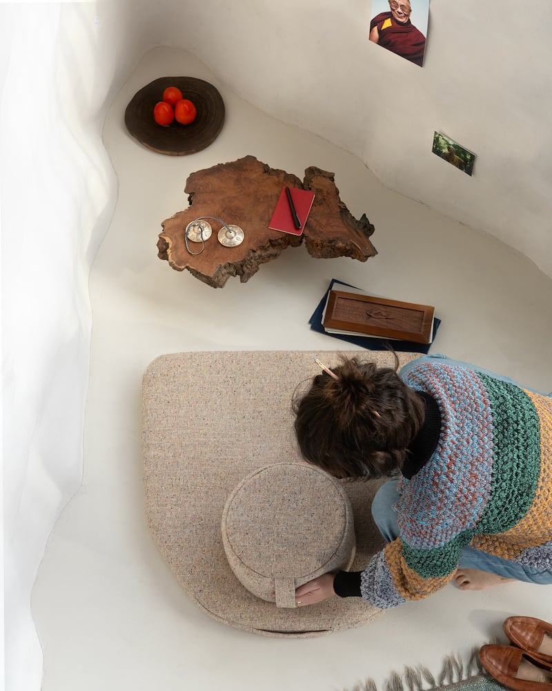 A soft cushion for your hard edges. Cut from an Italian upholstery textile with a playful color-flecked silk/wool/linen blend, these sculptural forms live in your space like furniture and quietly nudge you to practice. Made in Portland, for creative people who sit. Available in two speckled colorways.