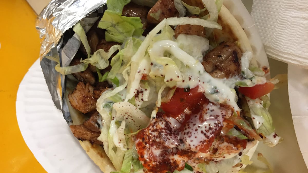 This recently opened cart isn't your typical shawarma, instead using charcoal-cooked chicken for their cigar-shaped wrap. It's smokey and pleasant chicken that recalls the stuff grilled up for family barbecues. They don't have a hummus side, instead selling a mini mezze platter with loose, soupy grape leaves.