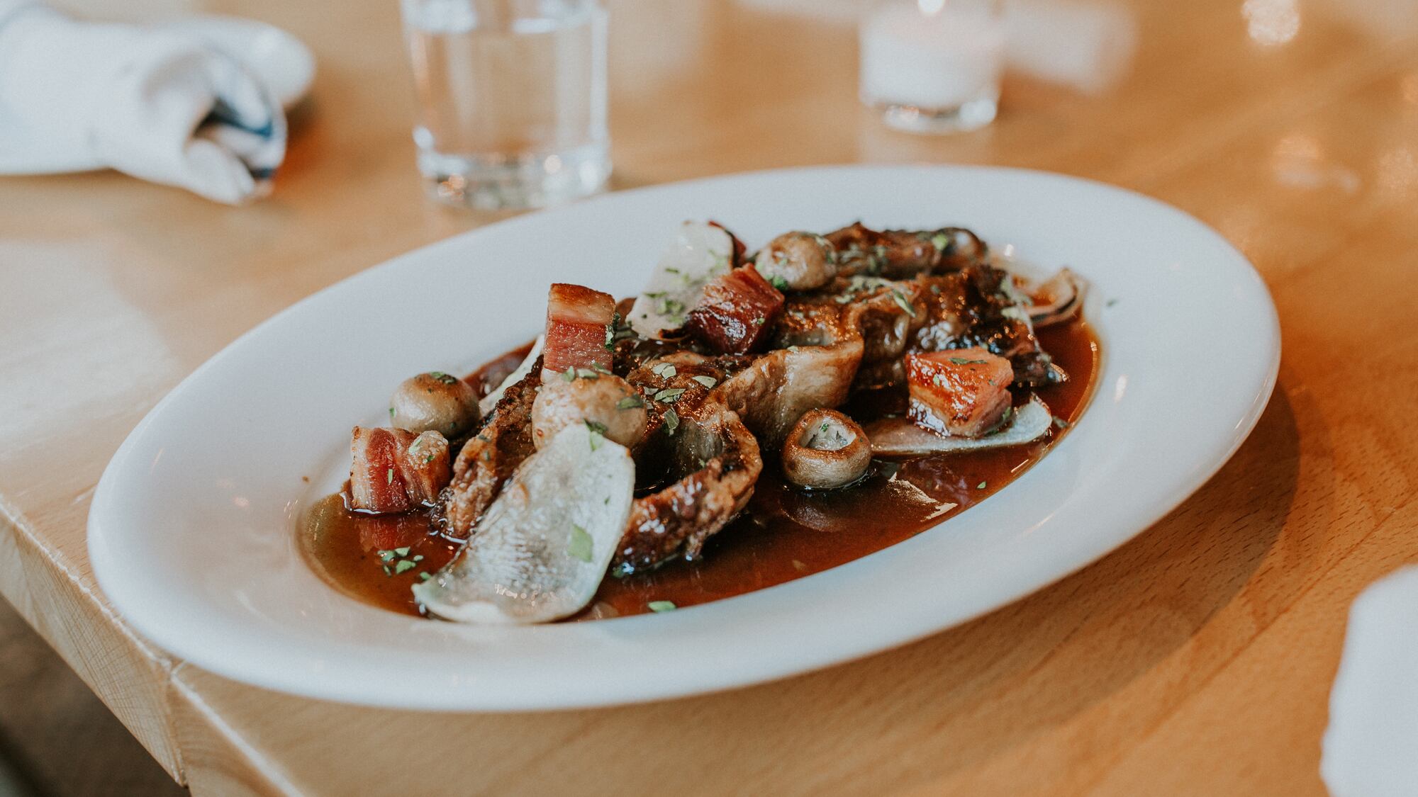 Among entrees, the beef shortrib bourguignon ($29) is deep, dark and delectable in its cloak of red wine- and beef broth-based sauce. The meat itself is juicy and practically spoon-tender, and it gets fist bumps from its roasted mushroom, cubed bacon and chopped onion plate mates. An accompaniment of buttered noodles gild the lily in an endearing way.