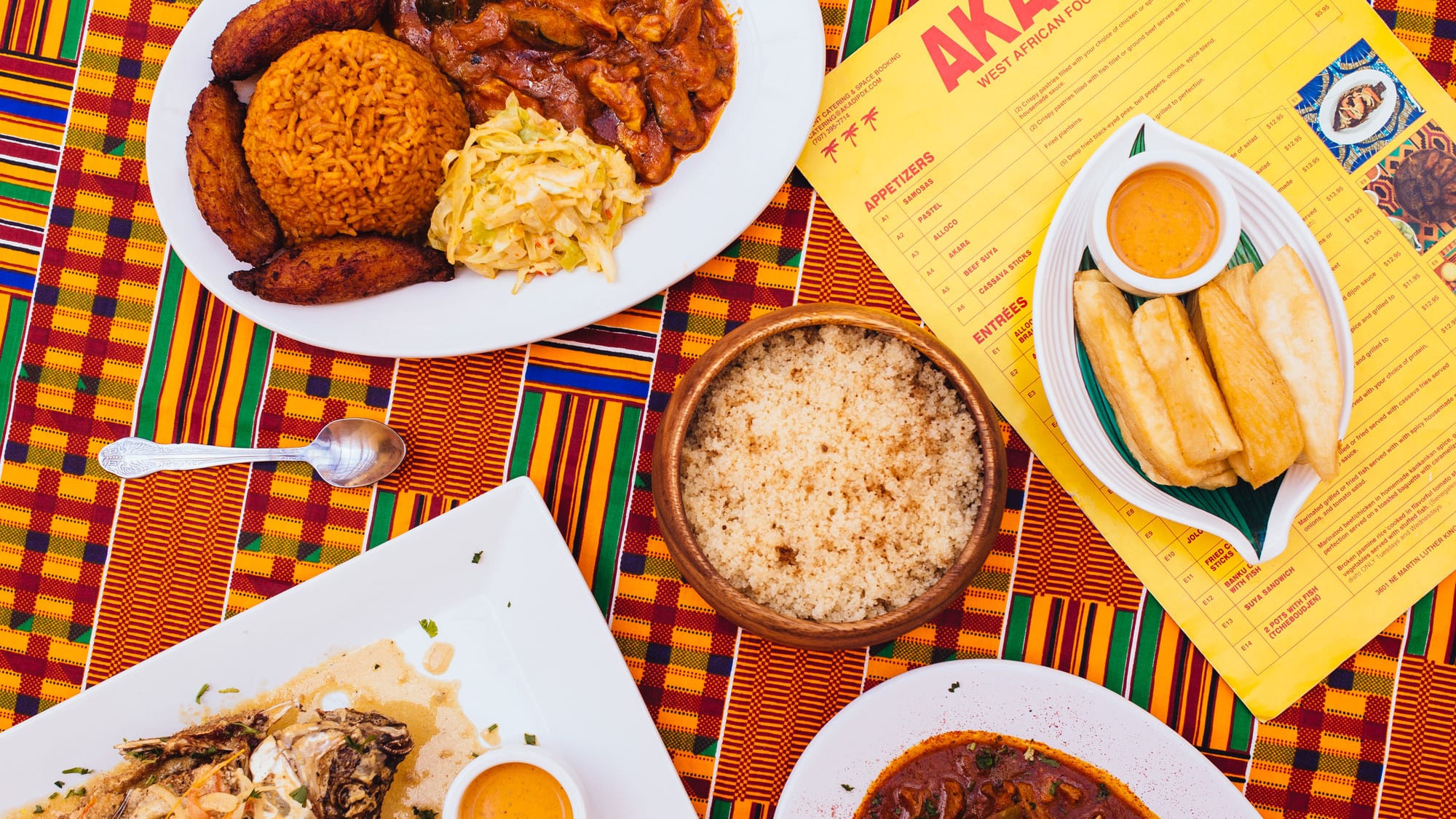 Akadi is a humble space with a warm orange, red and green color scheme, decorated with African kente tablecloths and a large mural of a sunset over an African plain. At times, it buzzes with people wearing vividly dyed boubou robes and V-neck dashiki.