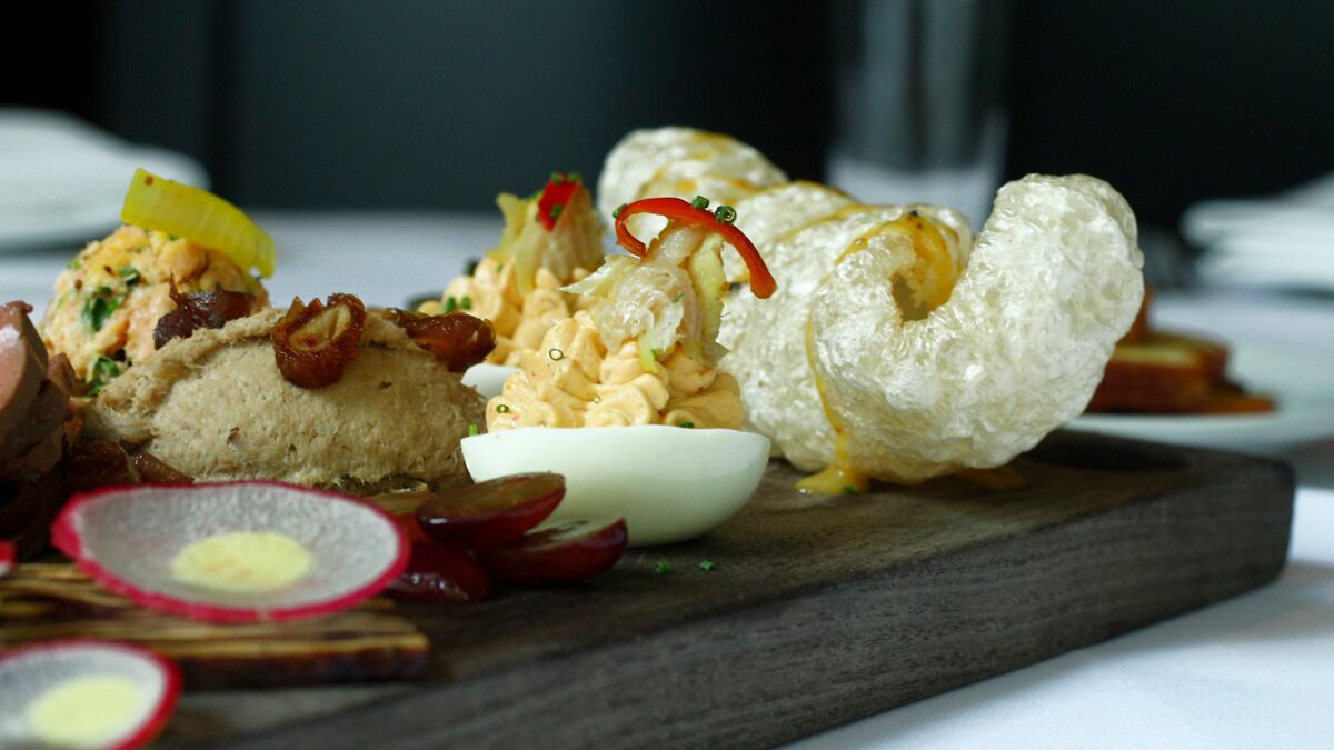 The restaurant's downtown dining room is best described in a word: sultry. Red leather booths line one wall beneath baskets of cascading big-leaved philodendrons and teardrop-shaped lights. A pair of large antlers marks the kitchen entrance, and metal-stamped ceiling tiles shine softly overhead.