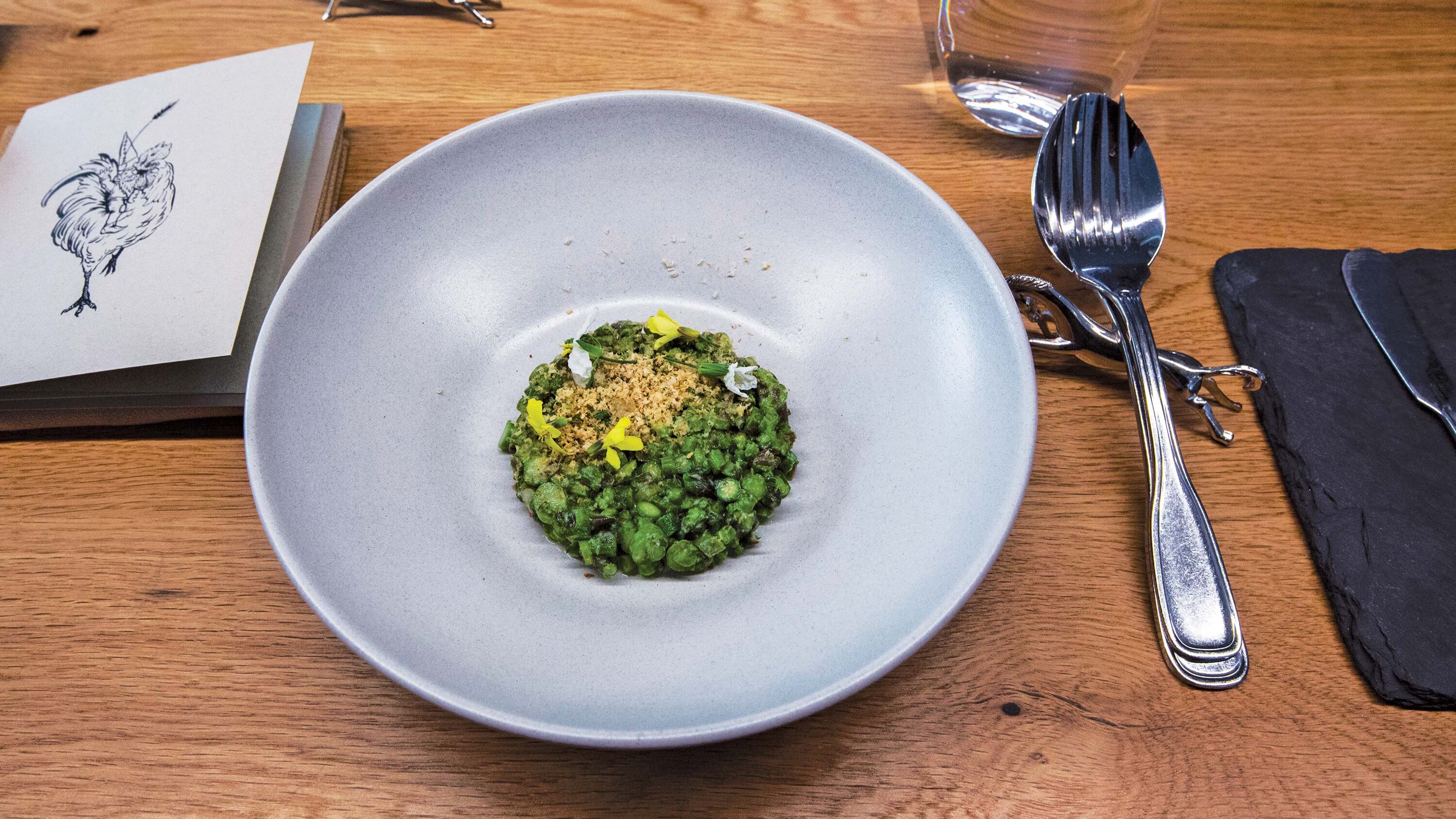 We went with the truncated, dining room tasting menu ($89 per person). The first thing that arrived at our table was a platter of spongy, housemade rye bread, crisp pickled fiddleheads and a savory beige hazelnut spread, shaped like a tiny cheese wheel and covered in dried nettle and spring garlic. Unlike other vegan "cheeses" that attempt to mask the flavor of the puréed nut base, it tasted strongly of hazelnuts: a slightly smoky, almost strangely sweet undercurrent beneath the herby crust. But after the initial dissonance, the fact that the spread wasn't pretending to be something else became its greatest strength. Richly nutty, earthy and herbaceous, it tasted like an entire forest condensed into a paté.