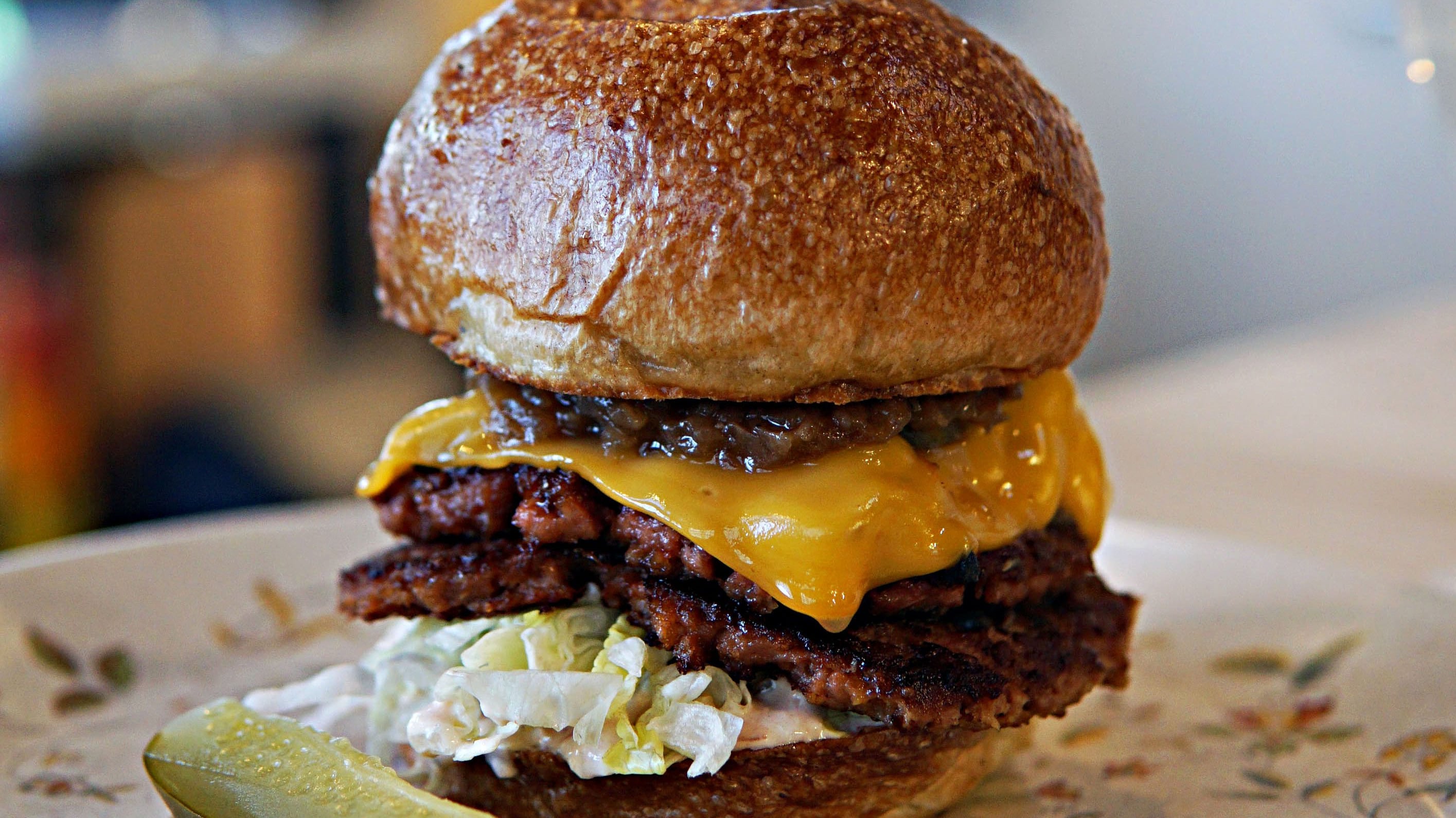 When this California transplant—an employee-owned brewery with an all-vegan menu, a bar tiled with retro floppy disks, and a giant Randy "Macho Man" Savage piñata hanging from the ceiling—first opened, I wanted to hate it, but damn if the burger doesn't rule. It starts with two Beyond Meat patties, well-crusted with gooey coconut cheese, and tart pickles. A shallot jam lends a ketchuplike sweetness to the burger, and smoked mushrooms add a rugged umami, giving the illusion of outdoor grilling. Housemade vegan Thousand Island dressing and shredded iceberg keep it moist. On the first visit, the juice was running down Rishi's arm, the sandwich threatening to fall apart in his hands. Having been a vegetarian his whole life, he'd never had to deal with a truly juicy burger before. Due to the double patties, it's also one of the most meaty and balanced of the burgers I tried, which is why it's No. 1.