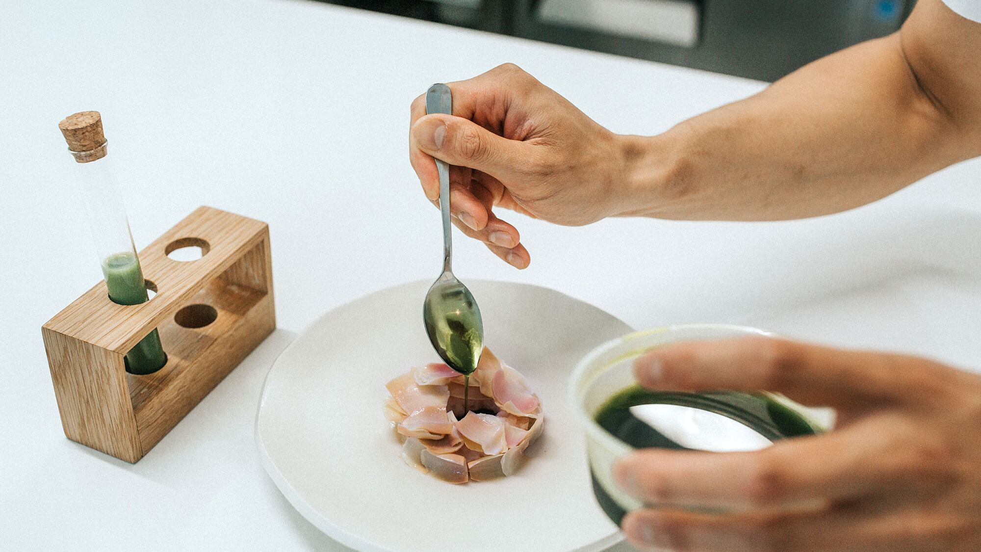Next came a ring of ground pink shrimp topped with tender, pale golden and purple-pink artichoke petals, the ones you have to dig all the way to the center to extract. Inside the ring was a deep emerald pool of fig leaf oil. A test tube of warm mussel broth, jade-colored from an infusion of parsley puree, accompanied the dish, with instructions to pour it inside the ring before consuming. The visual delicacy and muscular brininess of this course was a deft study in multisensory contrast.